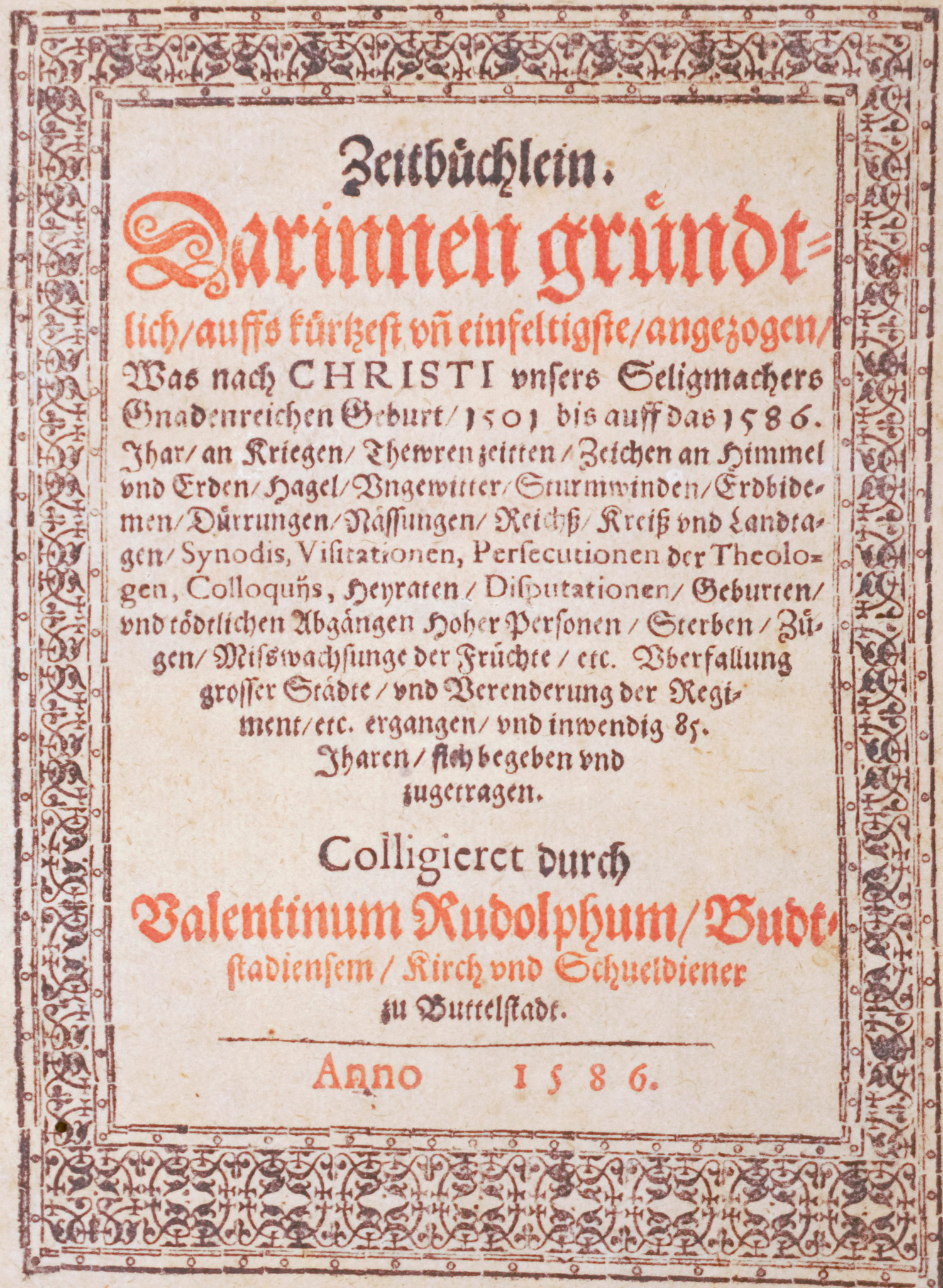 Rudolph, Valentin. Zeitbüchlein. Darinnen gründtlich auffs kürtzest und einfeltigste angezogen. 74 nn. Bl. Mit Holzschnitt-Titelbordüre. Titel in Schwarz und Rot. Modernes Halbpergament (leicht berieben und bestoßen). Erfurt, Gregor Baumann, 1586.