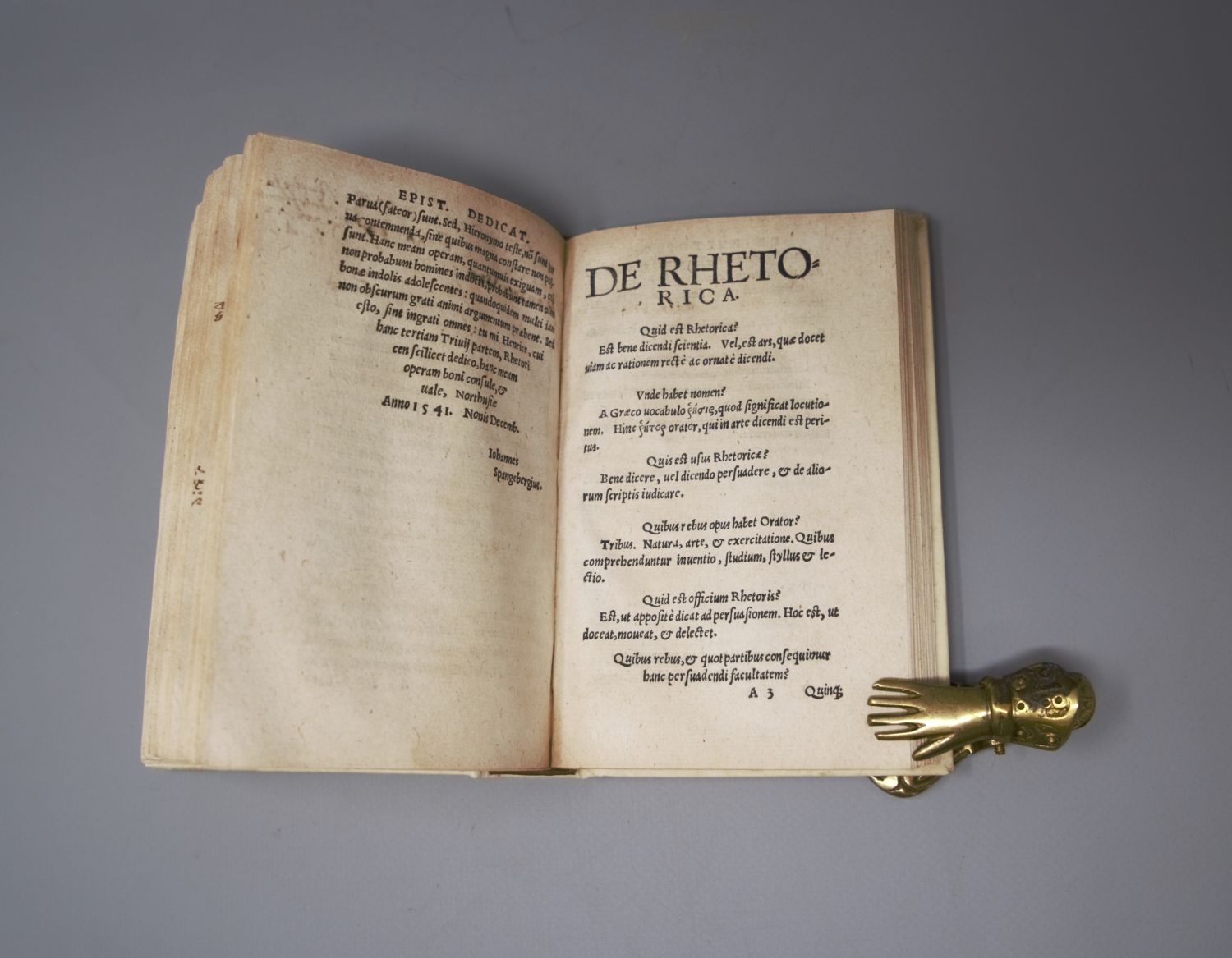 VD16 ZV 14587. – Seltene Kölner Ausgabe der lateinischen Grammatik des bekannten Kirchenreformators Johannes Spangenberg (1484-1550), der in Stolberg im Harz Rektor der Lateinschule war, das Schulwesen aufbaute und den Südharz reformierte. – Titel und letztes Blatt fleckig und mit hs. Bemerkungen alter Hand, Titel mit Hinterlegung. Die mittleren Lagen mit größerem Wasserfleck. Ingesamt ordentliches Exemplar.