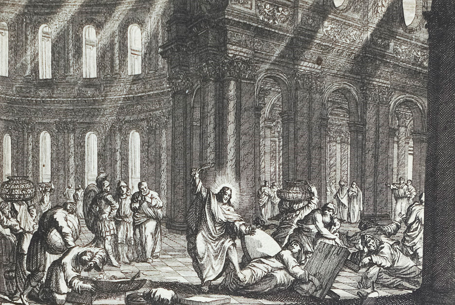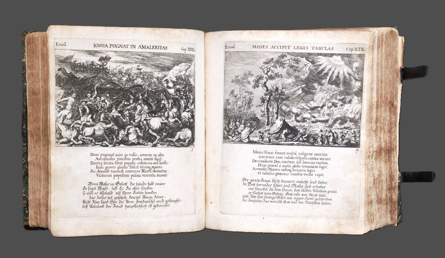 Küsel, Melchior. Icones Biblicae Veteris et Novi Testamenti. Figuren Biblischer Historien Alten und Neuen Testaments. 5 Teile in 1 Band. 4 Bl. Mit insgesamt 250 Kupfertafeln (inkl. Frontispiz, Kupfertitel, Zwischentitel und gestochenem Schlussblatt). 20,5 x 17,5 cm. Leder des 19. Jahrhunderts (stärkere Gebrauchsspuren). Augsburg, Melchior Küsel, 1679.