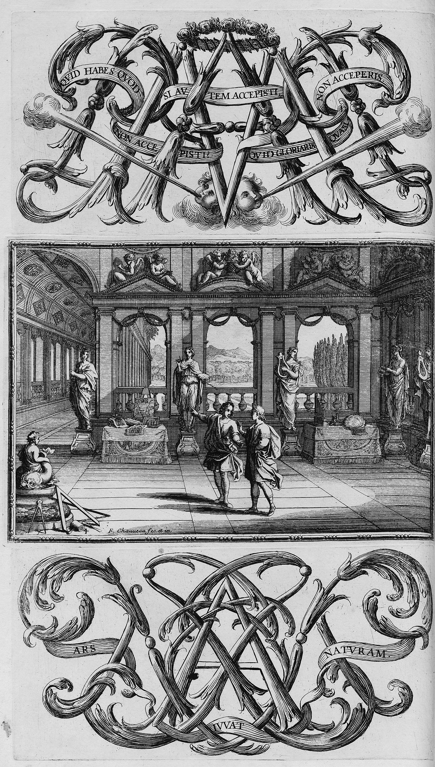 Desmarets (de Saint-Sorlin, Jean). Les délices de l'esprit. Dialogues dediez aux beaux esprits du monde. 4 Teile in 1 Band. Mit 4 Kupfertiteln, 18 Kupfertafeln und zahlreichen Holzschnittvignetten. 35,5 x 23 cm. Marmoriertes Leder d. Z. (leicht berieben und etwas fleckig) mit goldgeprägtem RTitel und RVergoldung. Paris, Florentin Lambert, 1661.