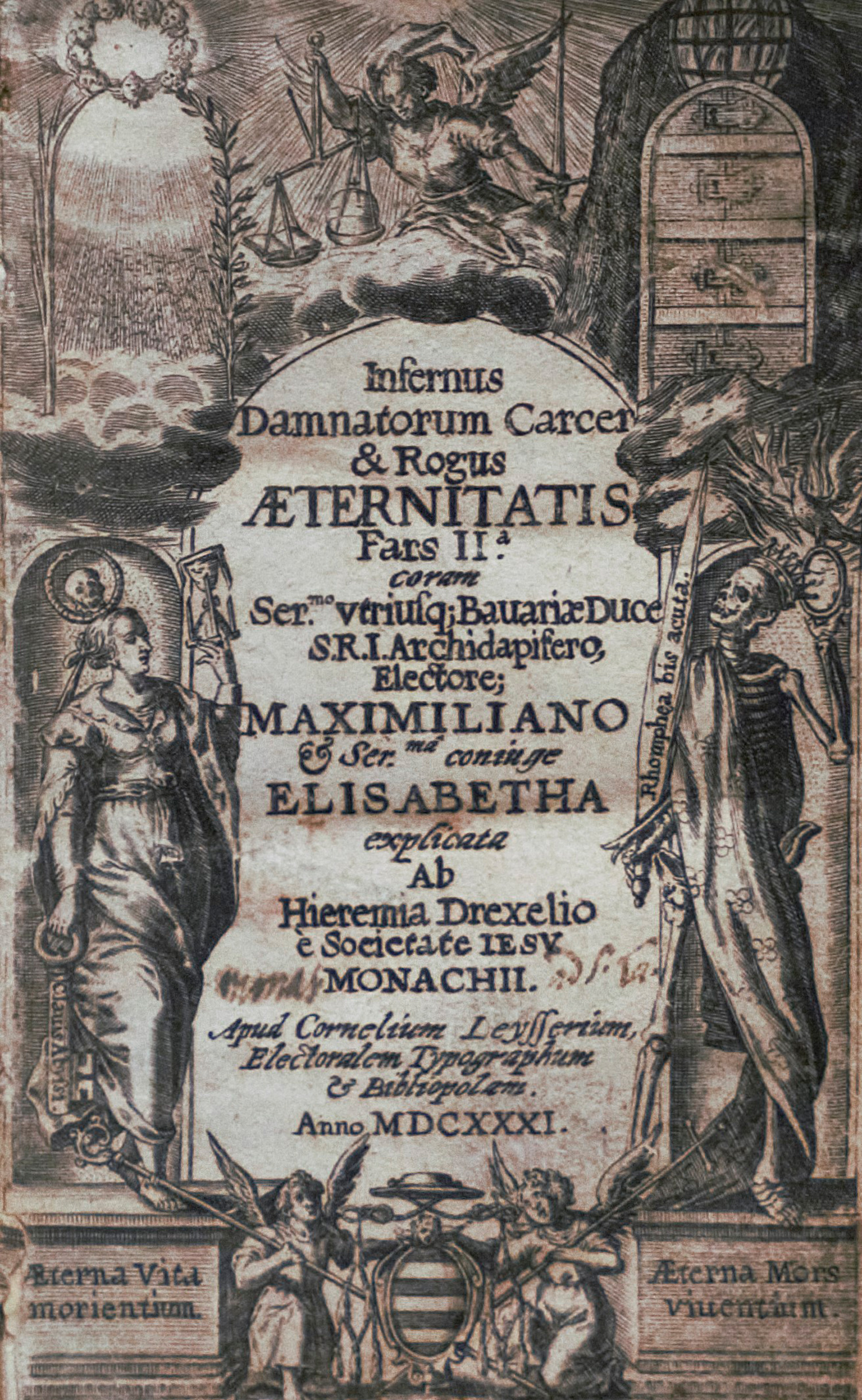 Dünnhaupt II, 15.1. Breidenbach 239. Kosch III, 543. Landwehr GEB, 258. Pörnbacher 182. Vgl. De Backer-Sommervogel III, 195, 15 (Ausgabe Antwerpen, 1631). – Erste Ausgabe. "Zusammen mit De Aeternitate (1620) und Caelum (1635) als Trilogie konzipiert. Ungemein grausige und drastische Schilderung der Höllenqualen; nichtsdestoweniger lautet die anon. engl. Übers.: A Pleasant [!] and Profitable Treatise of Hell" (Dünnhaupt). – Das Titelblatt mit mehreren hs. Besitzvermerken. Vorsatz stärker beschmutzt. Durchgehend etwas stockfleckig, kleiner Wasserrand, wenige Tafeln mit kleinen Hinterlegungen.