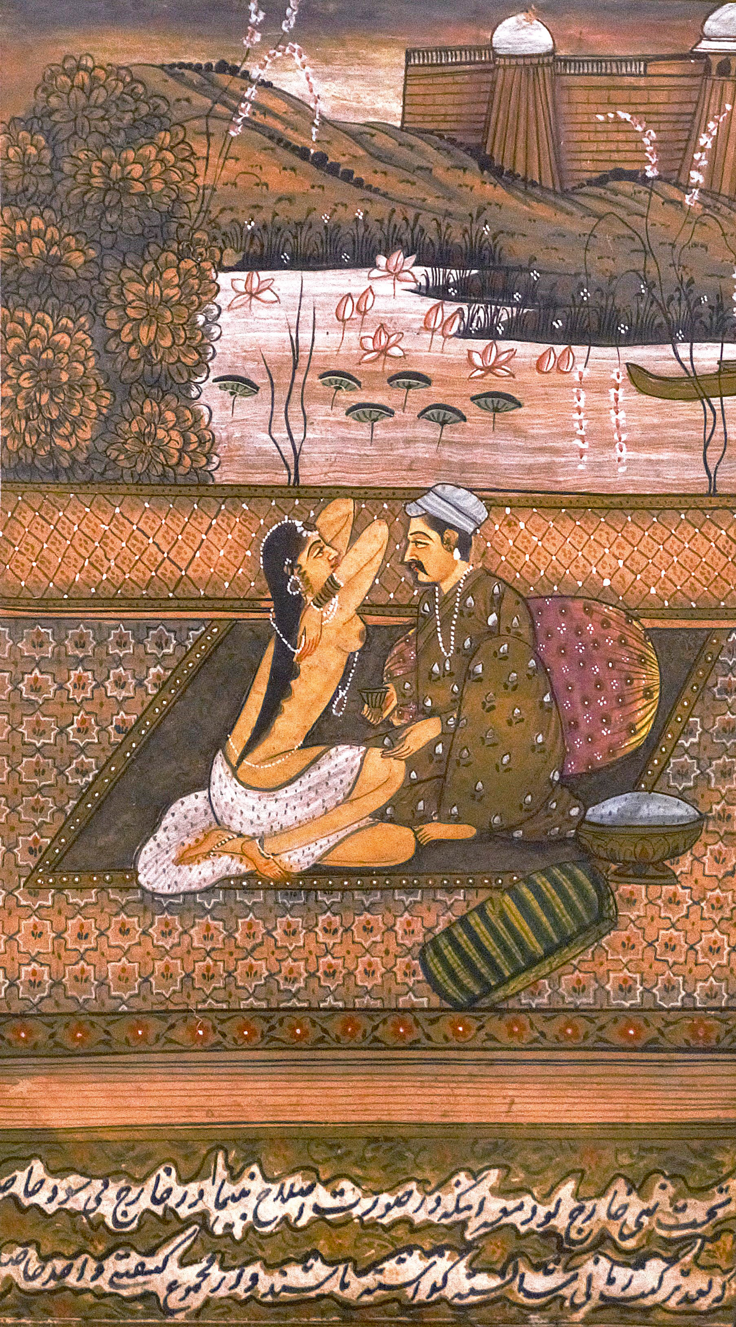 Eros-Miniaturen. 2 indopersische Miniaturen in Gold und Farben, gemalt auf alten Handschriftenkartons mit der Darstellung von Szenen höfischer Liebe im Mogulreich. Ca. 19 x 10,5 cm. Mit Passepartout unter Glas. 25 x 18,5 cm. Indo-persischer Raum um 1857.