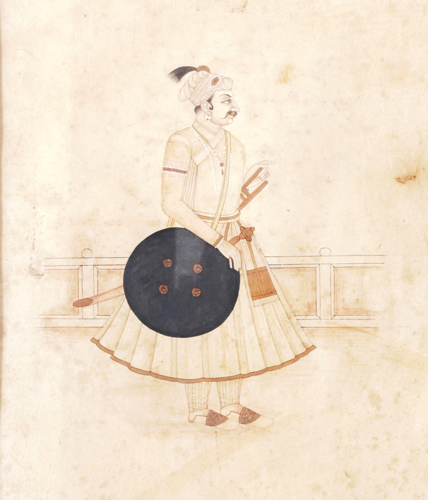 Dargestellt ist wohl ein islamischer Herrscher mit Jama-Jacke und einem Katara-Dolch im Gürtel. Typisch für Darstellungen des 17. Jahrhunderts, hier möglicherweise aber auch eine spätere Malerei. – Papierbeding etwas gebräunt und etwas fleckig, sonst wohlerhalten. Nicht ausgerahmt, Versand nur ohne Rahmen.