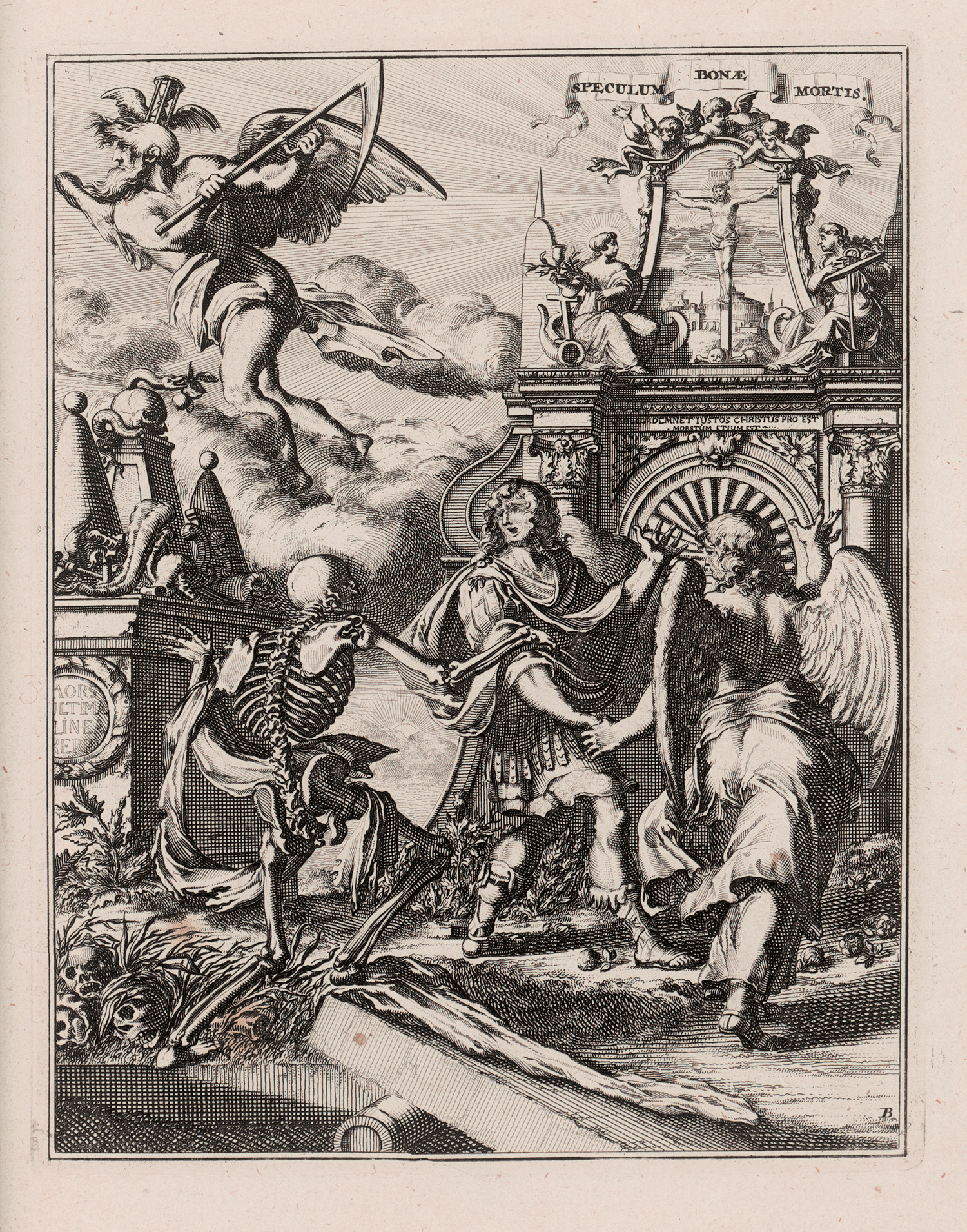 Landwehr, French emblem books 180. Landwehr, De Hooghe, 84. Cohen-R. 232. Brunet I, 1834. Graesse II, 130. – Erste französische Ausgabe. Die gratigen Kupfer zeigen Sterbende, die vom Teufel versucht werden und gleichzeitig von Engeln und Priestern gerettet werden sollen. – Etwas finger- und stockfleckig, Tafel XXX mit Einriss im weißen Rand, sonst nur geringe kleine Randläsuren. Sehr breitrandiges Exemplar ohne restauratorische Eingriffe aus einer englischen Adelsbiliothek, mit entsprechendem Wappenexlibris auf dem Innenspiegel.