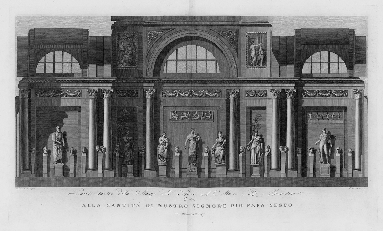 Graesse II, 567. Nicht in der Ornamentenstichsammlung. – Seltenes Werk von dem italienischen Stecher Vincenzo Feoli (1760-1827). Die eigentlich 24 großen Tafeln zeigen die neuen Räume des Museums, die von Pius VI. renoviert wurden. Enthalten sind zum Beispiel "Veduta prospettica della Stanza delle Muse nel Museo Pio-Clementino", "Veduta principale della Stanza rotonda nel Museo Pio-Clementino", "Porte prima della parete sinistra della Galleria lunga nel Museo Pio-Clementino", "Veduta generale in prospettiva del Cortile nel Mueseo Pio-Clementino", "Porte sinistra della Stanza delle Muse nel Museo Pio-Clementino" etc. – Es fehlt der Titel. Vorsatz minimal leimschattig und mit Wurmgängen. Mal mehr, mal weniger finger- und stockfleckig (Darstellung nicht betroffen), sonst gutes Exemplar mit gratigen Stichen. Selten im Handel.