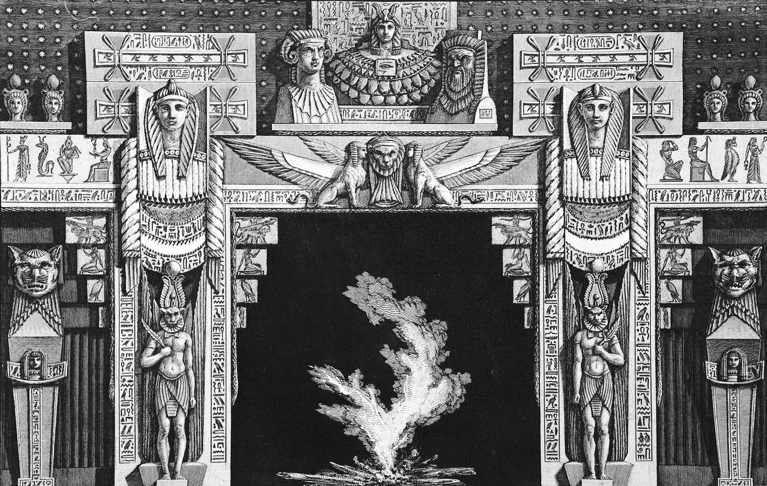 I. Kamin im ägyptischen Stil mit Sphinxfiguren, Götter- und Pharaonenfiguren; die darüberliegende Wandfläche mit Sternornamentik, über loderndem Feuer. - Wilton-Ely II, 869.