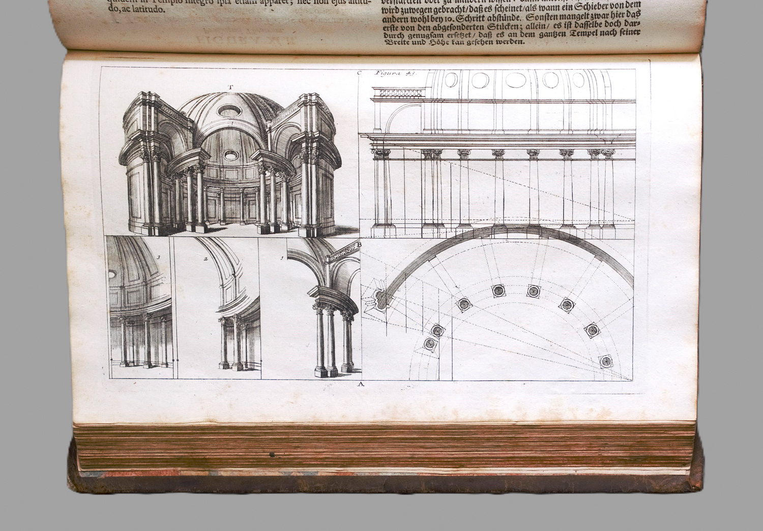 Brunet IV, 984. Vgl. Fowler 251 und 253. – Zweite Ausgabe mit deutsch-italienischem Paralleltext. Mit den verkleinerten Nachstichen von Boxbarth und Bodenehr nach der 1702 in Rom erschienenen Originalausgabe. Das berühmte, erstmals 1693 erschienene Werk über Baukunst und Perspektive des italienischen Malers und Architekten Andrea Pozzo (1642-1709) war von großem Einfluss auf die Architektur des gesamten 18. Jahrhunderts. Die Kupfer zeigen Gebäudegrund- und -aufrisse, Säulen, Kapitäle, Kuppeln und Portale, teilweise in Perspektiven, die der Phantasie entsprungen sind. – Portrait mit schmalem Blattausriss, Frontispiz und die beiden Textblatt in Band I gelöst, das Frontispiz auch mit Quetschfalte. Etwas fleckig, sehr wenige Tafeln mit Randeinriss.