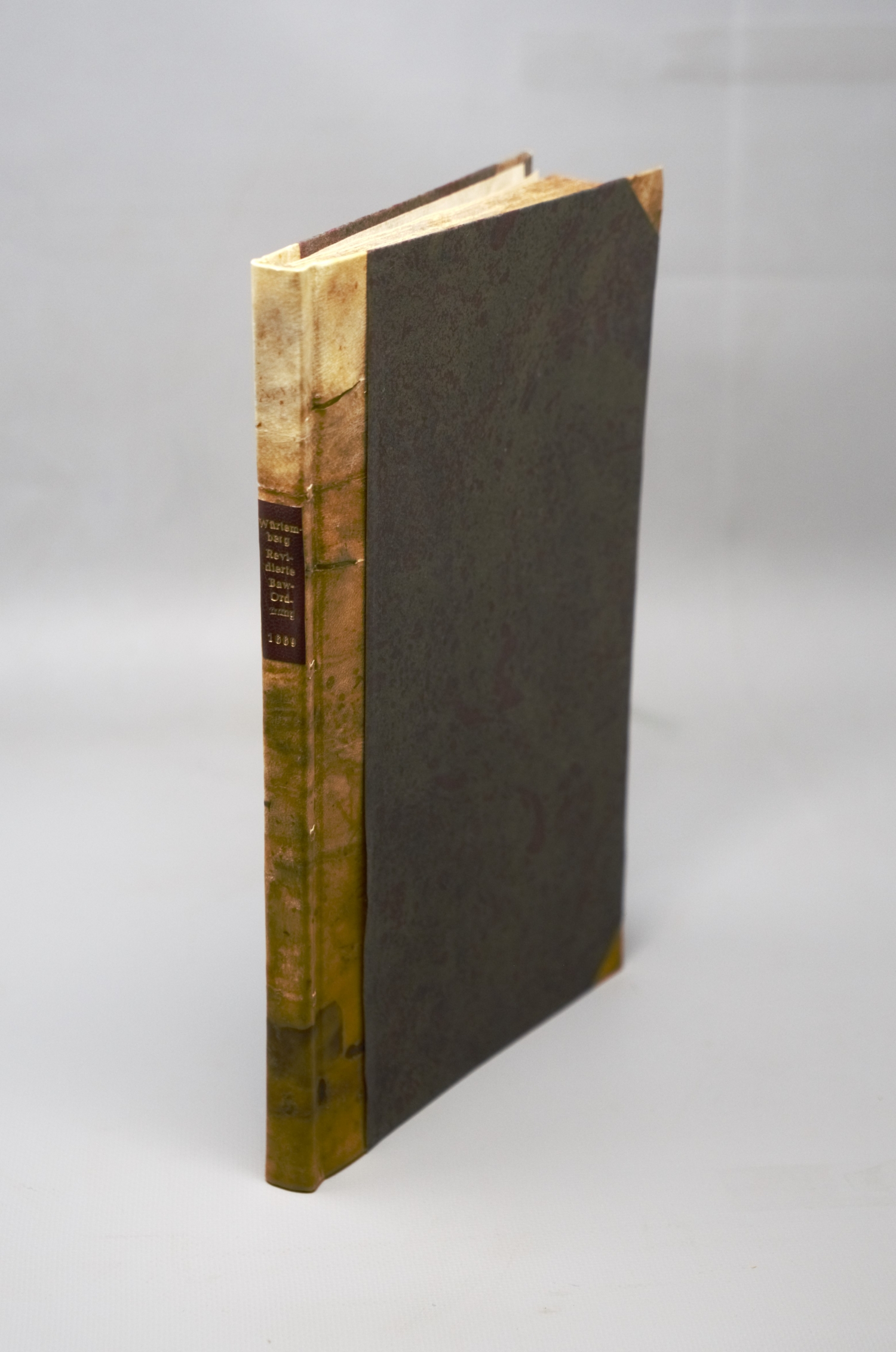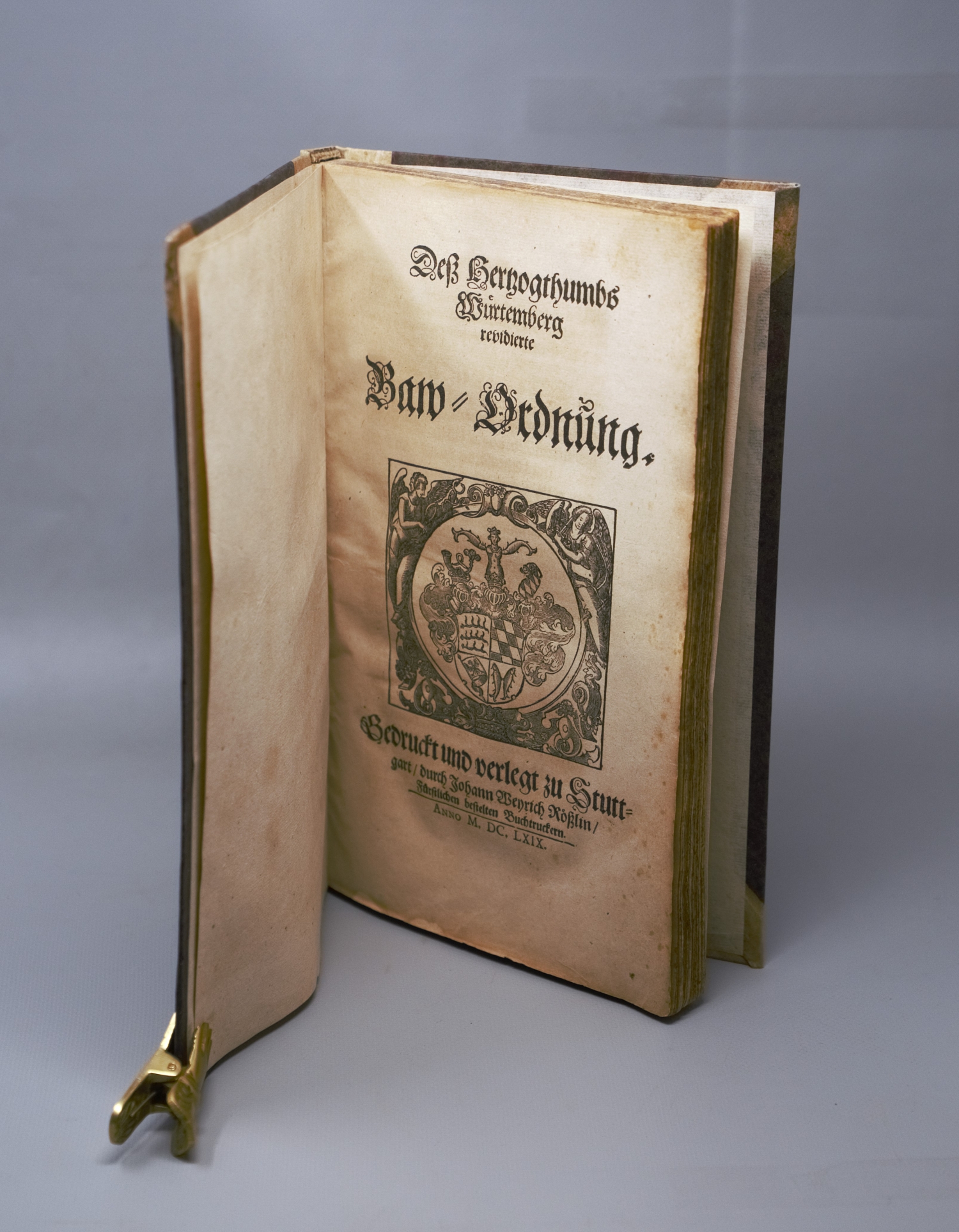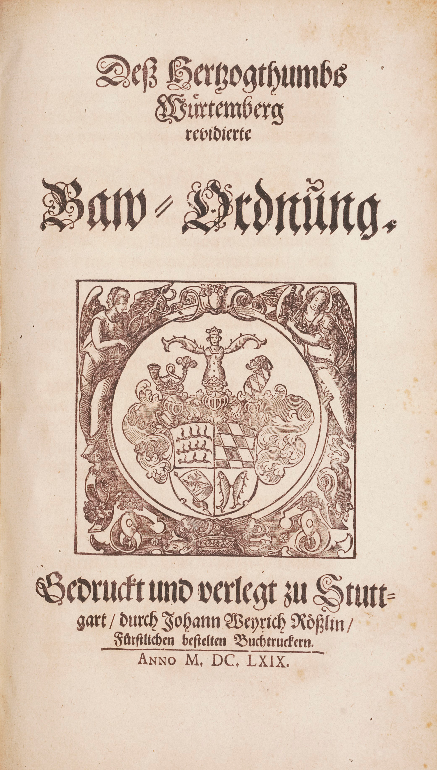 Württenberg. Des Herzogthums Würtemberg revidirte Bawordnung. 192 S., 4 Bl. Mit großem Holzschnitt-Wappen auf dem Titel. 29 x 17 cm. Halbpergament d. Z. (berieben, fleckig, etwas geworfen und mit kleinen Fehlstellen) mit späterem goldgeprägtem RSchild und restaurierten Deckeln. Stuttgart, Johann Weyrich Rößlin, 1669.