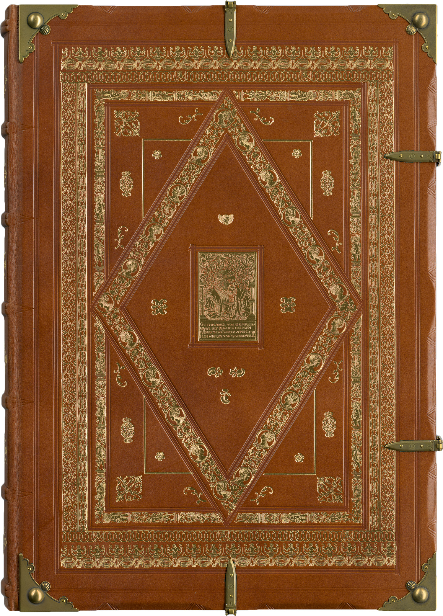 Die Ottheinrich-Bibel. Faksimile-Ausgabe der Handschrift Cgm 8010/I.2 der Bayerischen Staatsbibliothek München. Faksimile und Kommentar in 2 Bänden sowie Begleitheft und Mappe mit Probeseite. 53 x 37 cm bzw. 28,5 x 21 cm bzw. 56 x 40,5 cm Brauner OLederband mit Blindfileten und überaus reicher Goldprägung, 4 Metallschließen und 8 Eckbeschlägen in blauer OLeinen-Kassette (60 x 45 cm; leicht angestaubt) mit goldgeprägtem Titel auf dem Deckel bzw. OHalbleder mit goldgeprägtem RTitel. Luzern, Faksimile-Verlag, 2002.