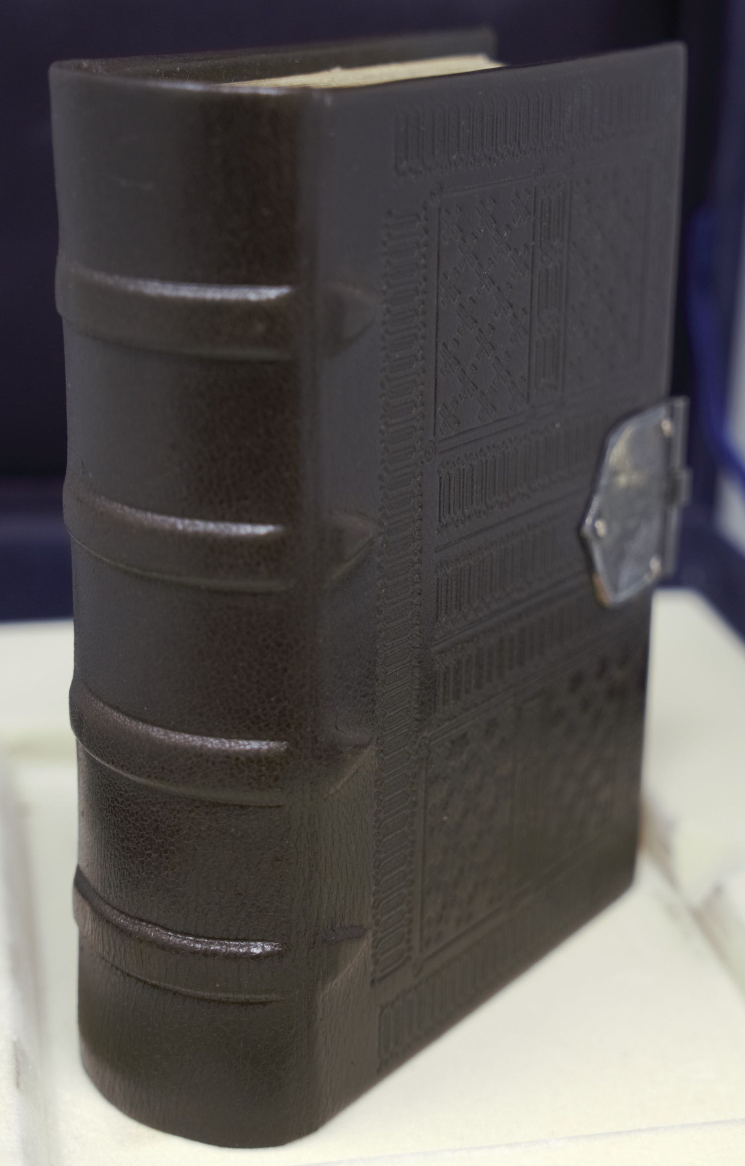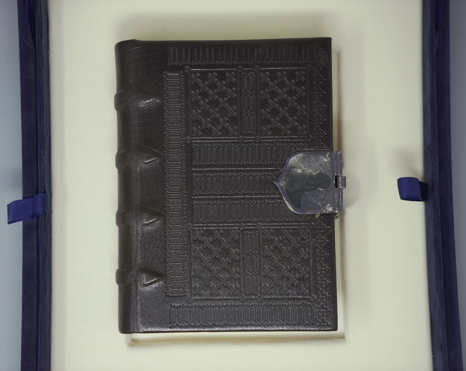 Das Stundenbuch des Gerard David. Ms. Vitrinas 12 der Real Biblioteca del Monasterio in San Lorenzo de El Escorial. Horarium flamenco de El Escorial. Faksimile und Kommentar. 2 Bände. 14,2 x 9,5 cm bzw. 21 x 14 cm. Reich blindgeprägtes OLeder (Schliessen leicht oxidiert) mit zwei silbernen Schliessen und dreiseitigem Goldschnitt bzw. OBroschur in dunkelblauem OSamtschuber (leicht angestaubt). Madrid, Testimonio, (1998) bzw. Münster, Biblioteca Rara, 2003.