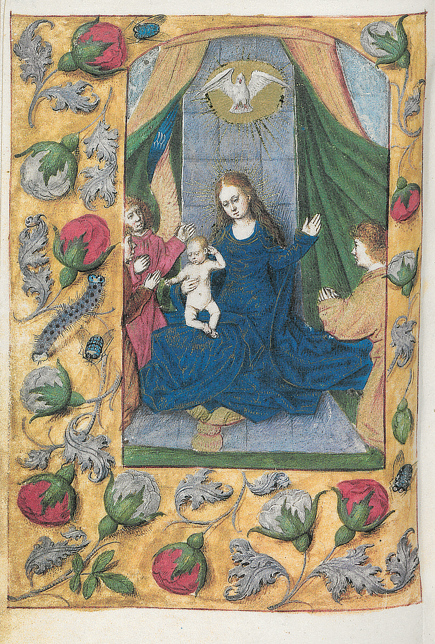 Das Liber Horarum wurde 1486 von Gerard David gefertigt, der hauptsächlich als Maler von Tafelgemälden tätig war und nur selten Buchmalereien ausführte. Mit der Ausführung der Miniaturen wurde der jüngere Künstler Jannieke Bollengier beauftragt. Die Miniaturen zeigen biblische Szenen und werden von breiten Zierrahmen umfasst. Diese sind angefüllt mit Blüten, Früchten, kleinen Tieren und Insekten, bis hin zu Phantasiefiguren. Die Textseiten sind mit zahlreichen kleinen bunten Initialen ausgestattet. – Nahezu neuwertig.