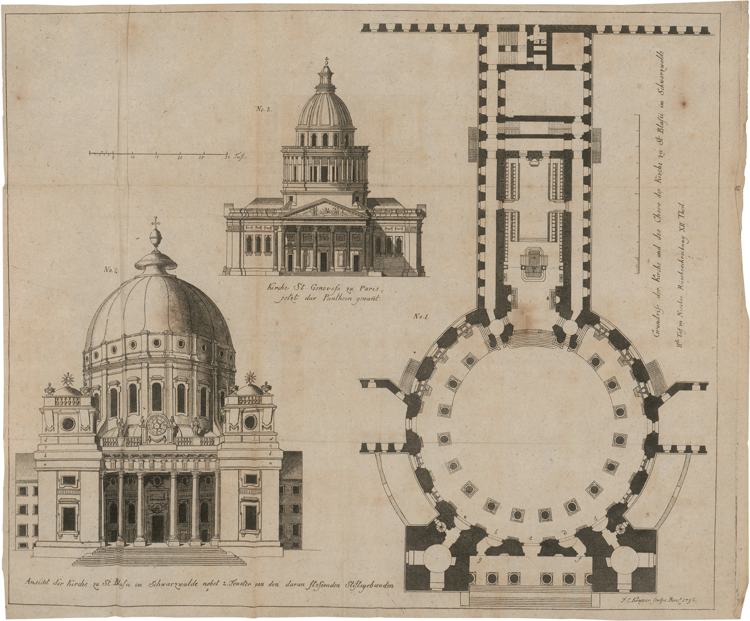 Schwerpunkt der ersten fünf Bände ist die Beschreibung von Wien. Band 6 ist vorwiegend München gewidmet, die Bände 7 und 8 Augsburg und der dort heimischen katholischen Propaganda-Publizistik. Nach einer Unterbrechung von acht Jahren erschien 1795 Band 9 mit der ausführlichen Beschreibung von Ulm. Nicolais Streit mit der neuesten Philosophie und Literatur, der für ihn in den 90er Jahren kennzeichnend ist, prägt vor allem die Bände 10 und 11, in denen er Württemberg betritt; Band 10 mit Stuttgart, Ludwigsburg, Hoher Asperg, Hohenheim und Calw, besonders aber Band 11, in dem er neben der Beschreibung von Tübingen sich mit Schelling u.a. und ausführlich mit Schillers Horen auseinandersetzt. Band 12 ist dem Besuch des Klosters St. Blasien gewidmet, in dem ihn mehr noch als der Neubau der Kirche der Abt Martin Gerbert beeindruckte. – Wenige Tafeln mit kleinen Einrissen, teils hinterlegt. Leicht gebräunt, kaum fleckig, die meisten Vorsätze hs. beschrieben, dort und auf den Titeln die Stempelungen herausgeschnitten und die Lehrstellen hinterlegt. Dekorative Reihe in einem guten Exemplar.