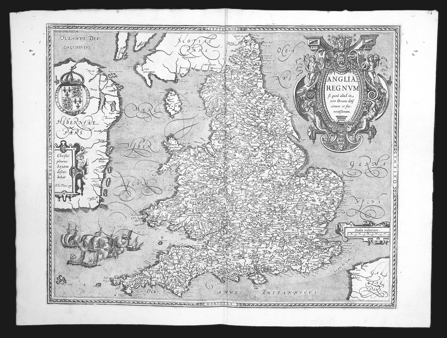 Ortelius, Abraham. Anglia regnum si quod aliud in toto Oceano ditissimum et florentissimum. Kupferstichkarte. 38 x 47,5 cm (Plattenrand) bzw. 42 x 56 cm (Blatt). Paris, Jean le Clerc, 1620.