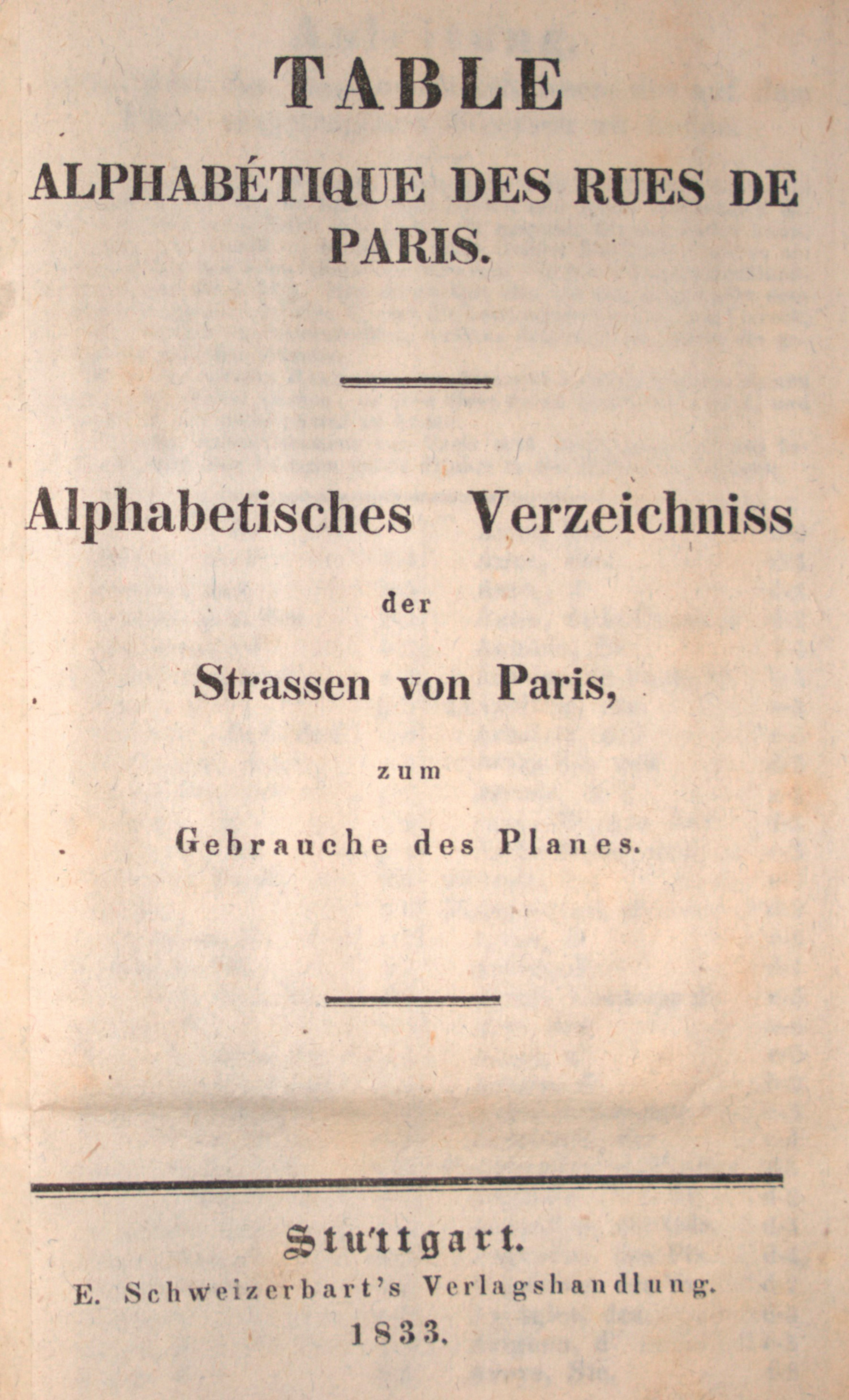 Paris. Table alphabétique des rues de Paris. Alphabetisches Verzeichnis der Strassen von Paris zum Gebrauche des Planes. 16 S. Mit gestochenem und gefaltetem Stadtplan. 16 x 10 cm. Spätere Broschur (minimal berieben). Stuttgart, E. Schweizerbart, 1833.