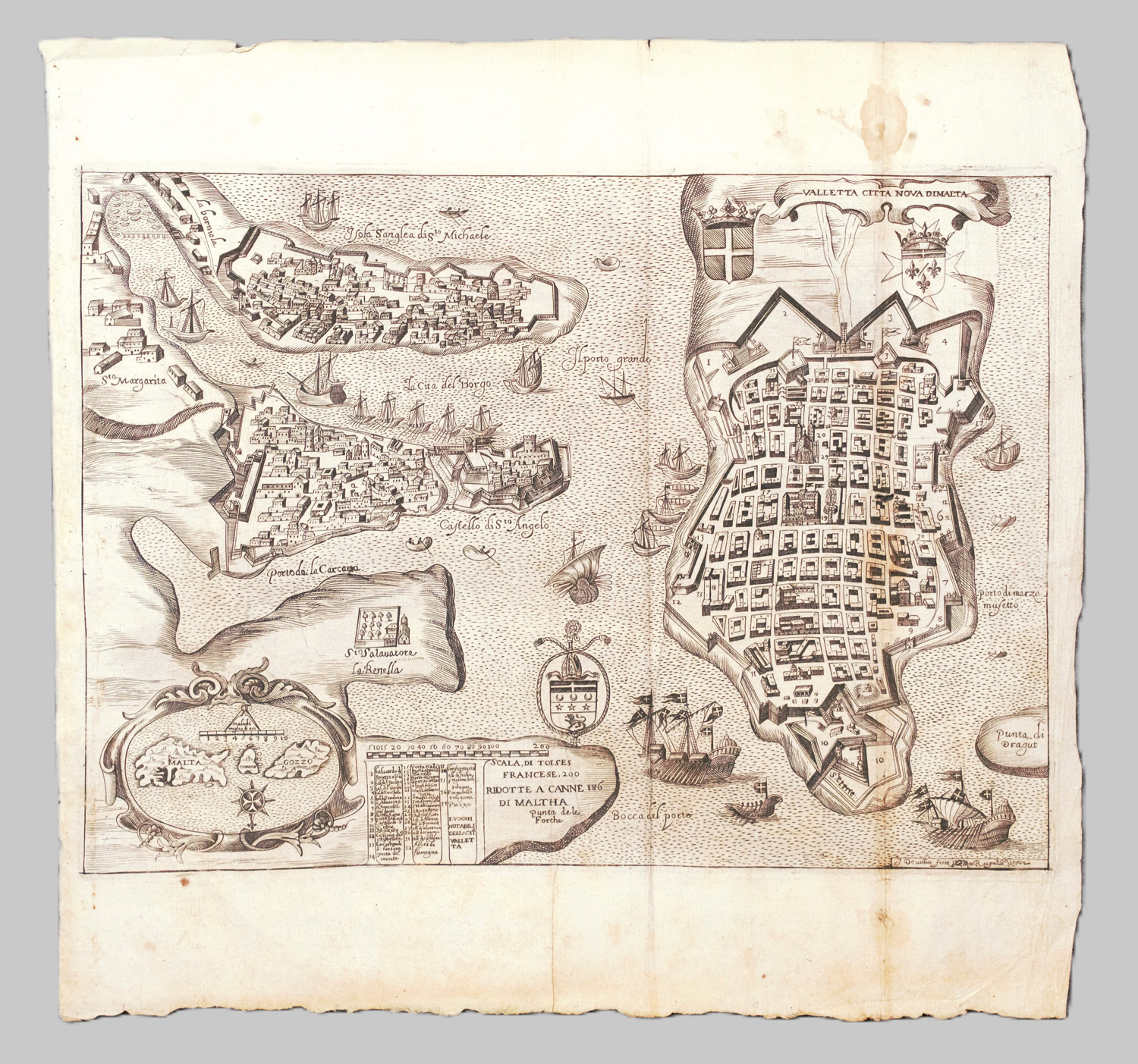 Die Karte zeigt detailliert die Stadt Valetta auf der Insel Malta und die drei südlich gelegenen Hafen, Festungen und Städten "Sanglea di Sto Michaele", "La cita del Borgo","Gastello di Sto Angelo", "Portodo la Carcana" und "Sto Salavatore". Mit drei Wappen, einer kleinen Insetkarte, einer Legende und Schiffsstaffage. – Mit Faltfalzen, etwas braun- und stockfleckig sowie mit kleinen Randläsuren und einer kleinen Fehlstelle (Darstellung betroffen).