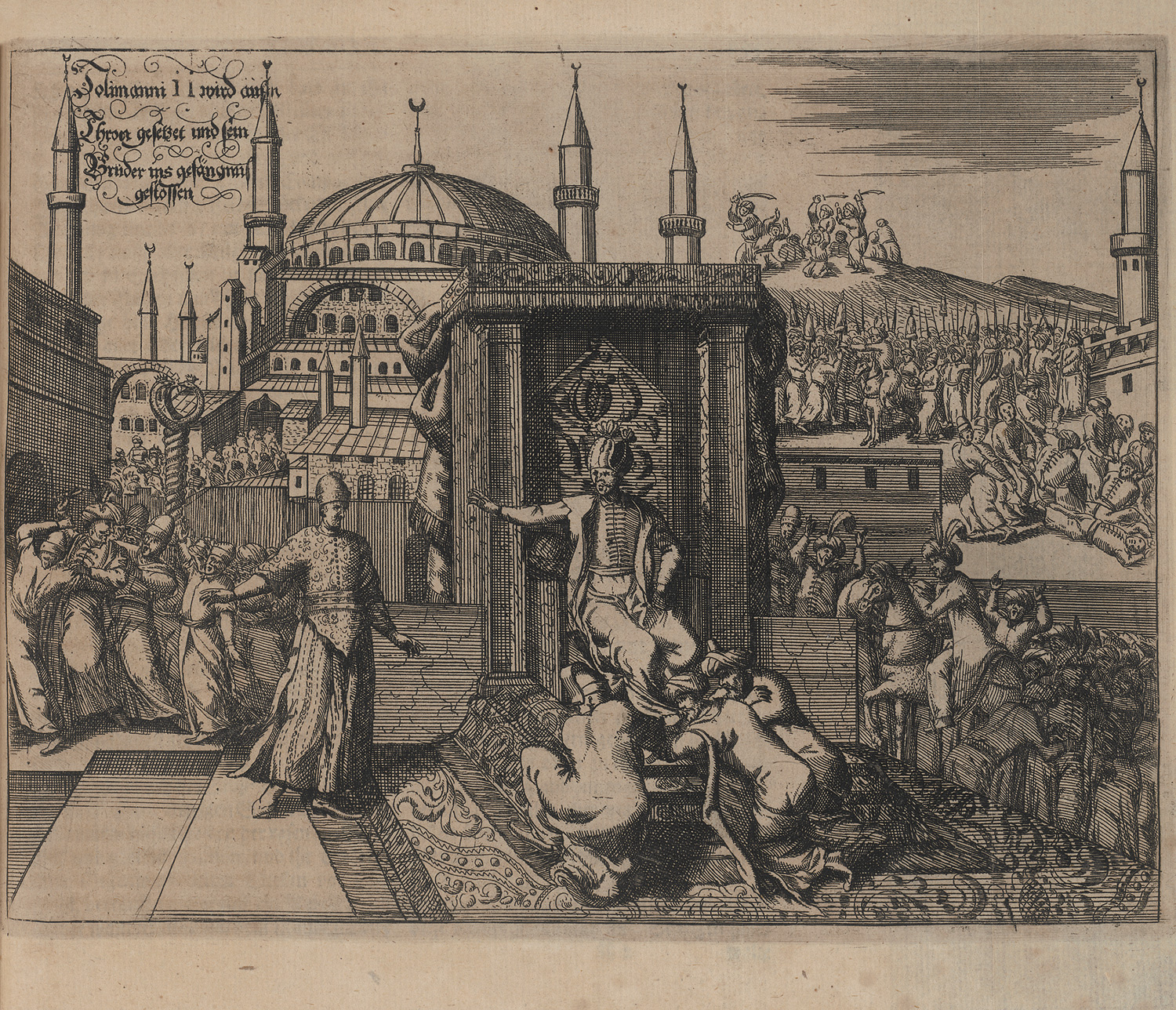 VD17 3:603404L und 3:603406A. – Erste Ausgabe des anonym zusammengestellten ausführlichen Berichts über die 15 Jahre währenden Auseinandersetzungen im Verlauf des großen Türkenkrieges von 1683 bis 1699 zwischen dem Osmanischen Reich und Österreich, Polen und Rußland sowie der Republik Venedig. Teil II mit separatem Titel. Die Kupfer mit zahlreichen Ansichten, Schlachten- und Belagerungsszenen. – Es fehlen die gefaltete Kupferkarte und sieben Kupfertafeln. Etwas gebräunt und fleckig, Titel etwas stärker fleckig und mit mehreren hs. Einträgen, erste Lagen mit etwas kräftigerem Braunfleck im weißen Seitenrand, Blatt C4 mittig mit Riss, Blatt F4 mit Fehlstelle in der rechten oberen Ecke (Verlust der Paginierung und einiger Buchstaben), Blatt J1 mit kleinem Eckabriss, letzte Blatt mit kleinem Tintenfleck im oberen Seitenrand. Beide Titel verso gestempelt. Die Kollation in Teil II springt von Seite 64 auf Seite 145. Innenspiegel mit hs. Eintrag und montiertem Wappenexlibris der Herzöge von Braunschweig-Lüneburg.