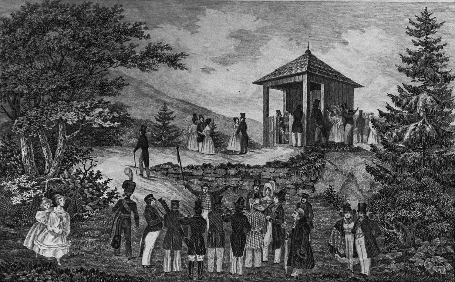 Trassler, Adolph. Andenken an Gräfenberg und Freiwaldau. 8 Feder-Lithographien. Illustrierte OBroschur (diese leicht angestaubt, fleckig). 20 x 25 cm. Troppau, Trassler, um 1850.