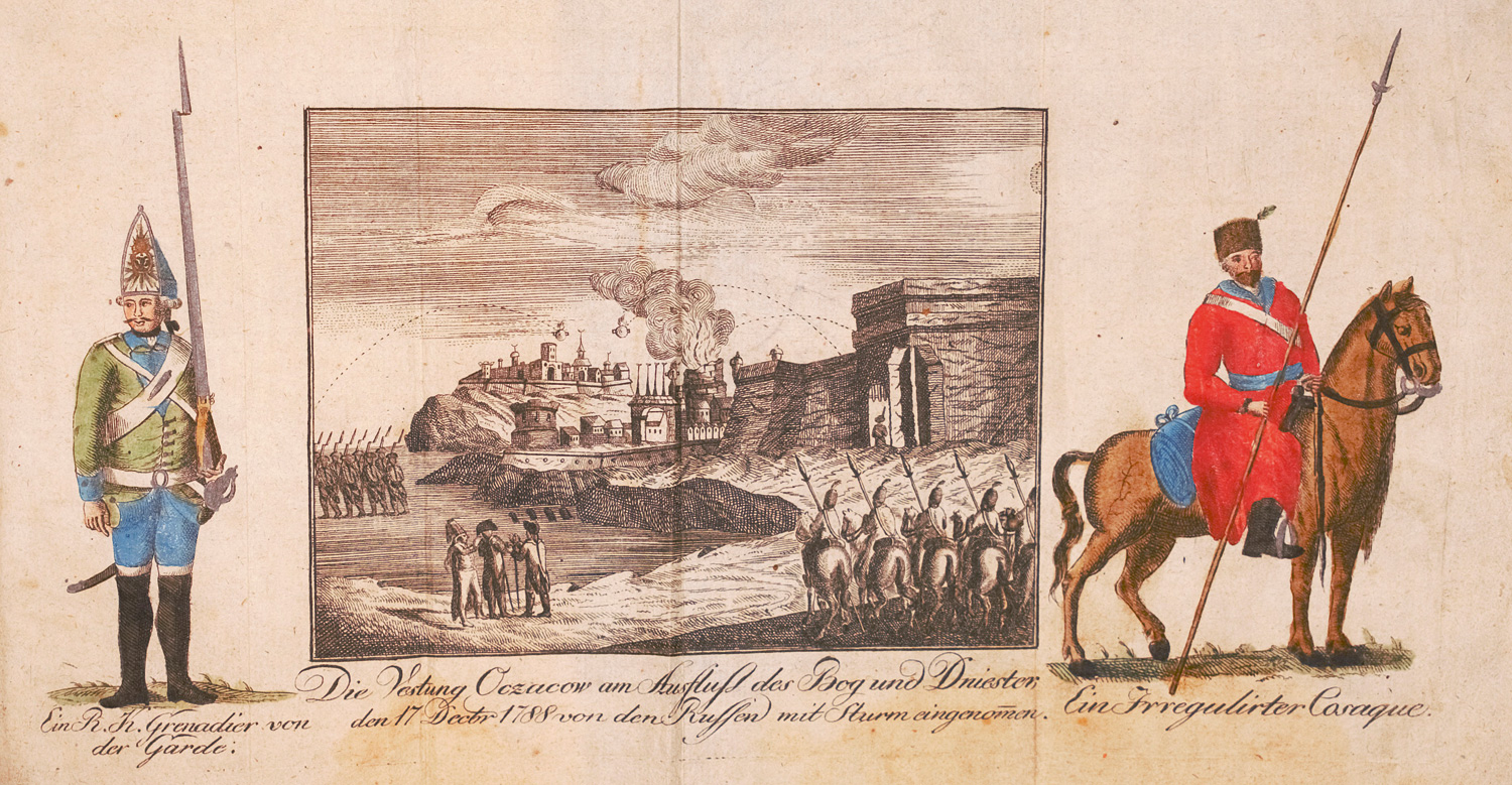 Einzige Ausgabe der anonym verfassten Chronik des Russisch-Osmanischen Kriegs von 1787 bis 1792, die allerdings nur die Anfangsjahre behandelt. Mit einer Karte der Krim sowie einem Ausschnitt der Schwarzmeerküste, ferner mit Darstellungen der Festung Oczakow, eines russischen Grenadiers und eines Kosaken. – Etwas braunfleckig, Teil II mit größerem Braunfleck im unteren Rand. Die Tafeln mit kleinen Randknicken.