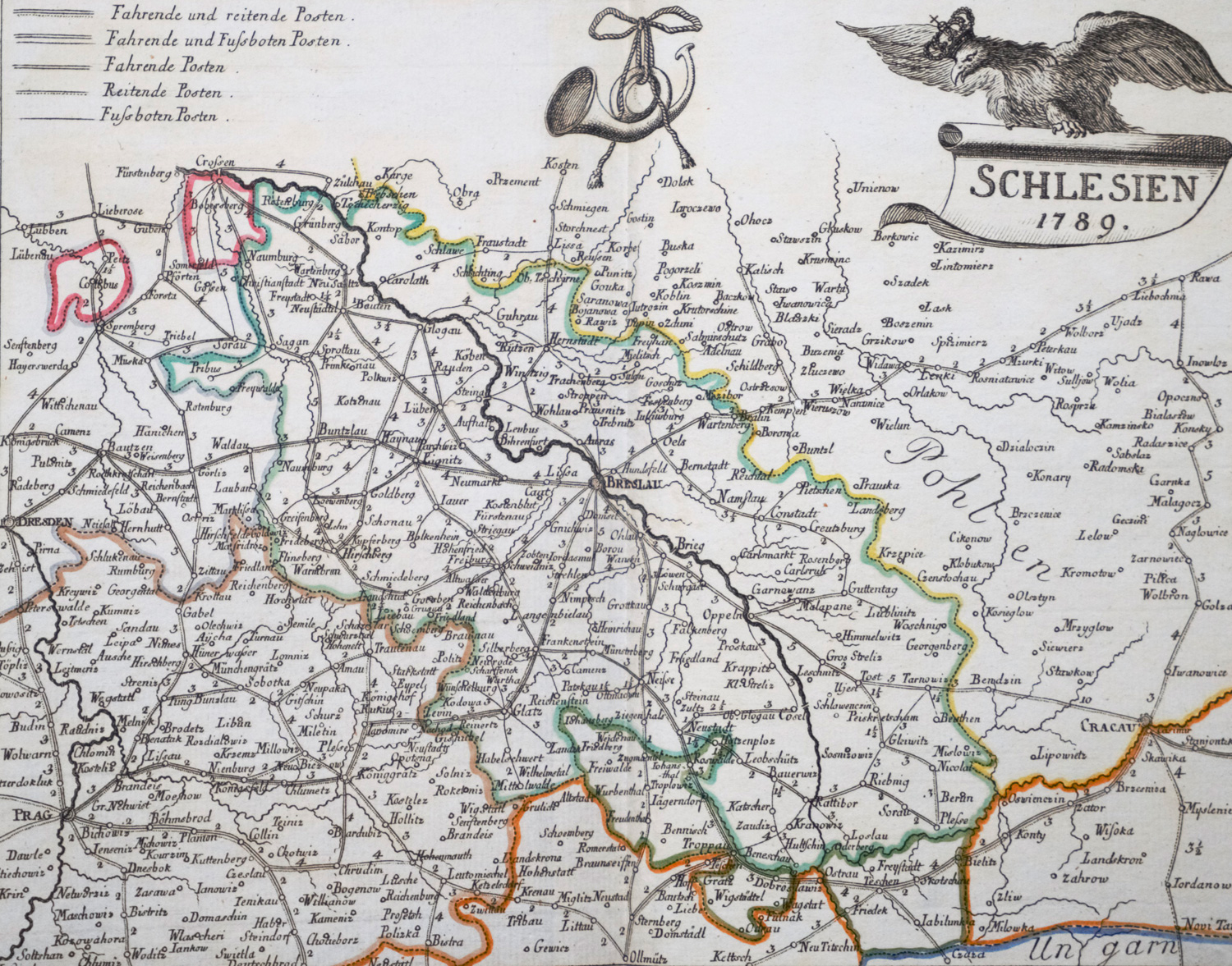 VD18 15299481. – Zweite und vermehrte Auflage. Mit einer Postkarte von Ostpreußen (nach Sotzmann) und Schlesien (nach Glassbach) sowie der mit prachtvollen Kartuschen ausgestatteten "Postkarte durch ganz Deutschland und durch die angränzenden Theile der benachbarten Länder" in 16 Segmenten von 1786 der Erben Homanns. – Vorsätze etwas leimschattig, Karten mit einem durchgehenden winzigen Wurmlöchlein. Die mehrfach gefaltete Karte gebräunt. Text und Karten auf starkem Bütten, frisch und fleckenfrei.