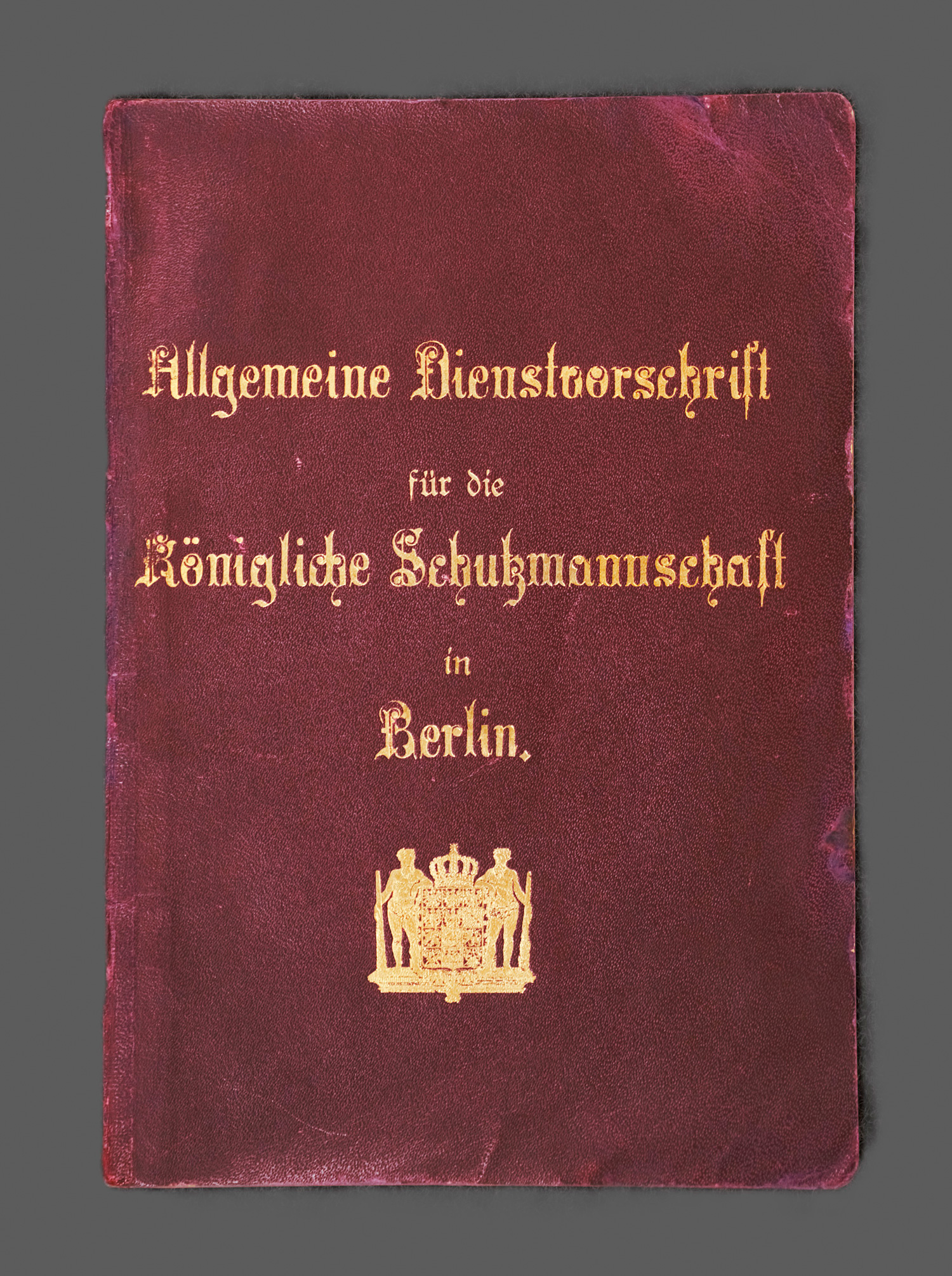Allgemeine Dienstvorschrift für die Königliche Schutzmannschaft in Berlin. 46 S. 22 x 15 cm. OBroschur (etwas berieben und mit schwachen Knickspuren) mit goldgeprägtem Deckeltitel. Berlin, Reinhold Kühn, (1902).