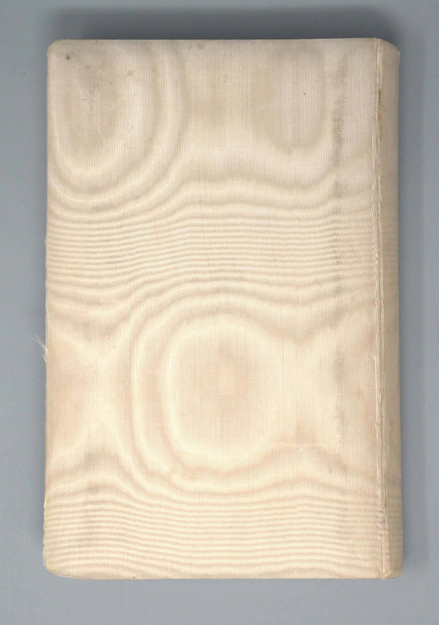 Einbände. - Weißer Moiréseidenband mit goldgeprägtem Deckeltitel, gelbem Seidenlesezeichenbändchen und dreiseitigem Goldschnitt sowie reliefgeprägten hell-türkisblauen Feinseidenspiegeln. Seitenschnitt mit kleinem Fore-edge Painting. 18,5 x 12 cm. England um 1900.