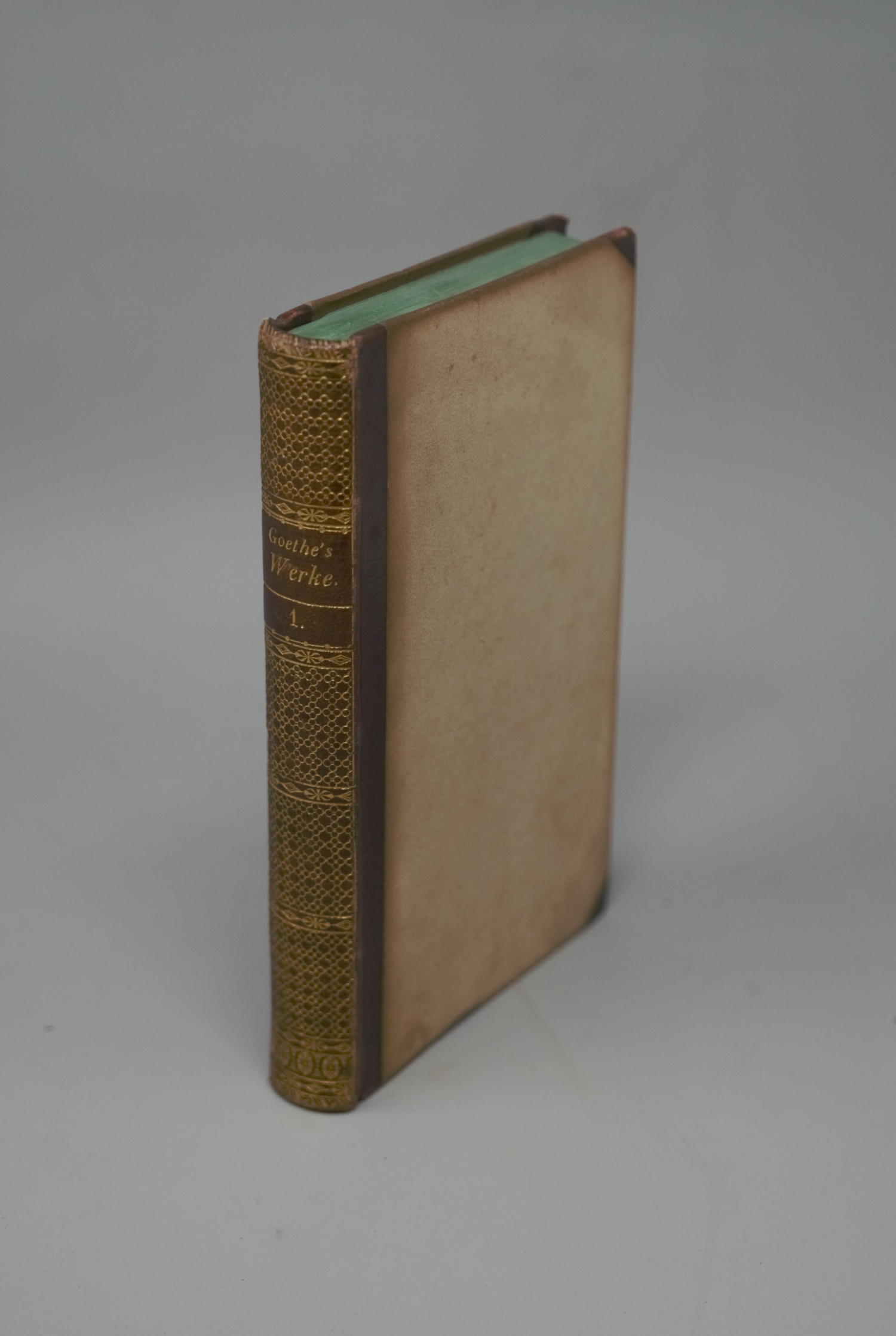 Goethe, Johann Wolfgang von. Werke. Vollständige Ausgabe letzter Hand. 40 Bände. Großoktav-Ausgabe. Mit 2 Falttabellen. 18 x 11 cm Neuere Halblederbände (etwas fleckig und leimschattig, die Rücken unterschiedlich stark ausgeblichen) mit flächendeckender ornamentaler RVergoldung und goldgeprägtem RTitel. Stuttgart und Tübingen, Johann Georg Cotta, 1827-1830.
