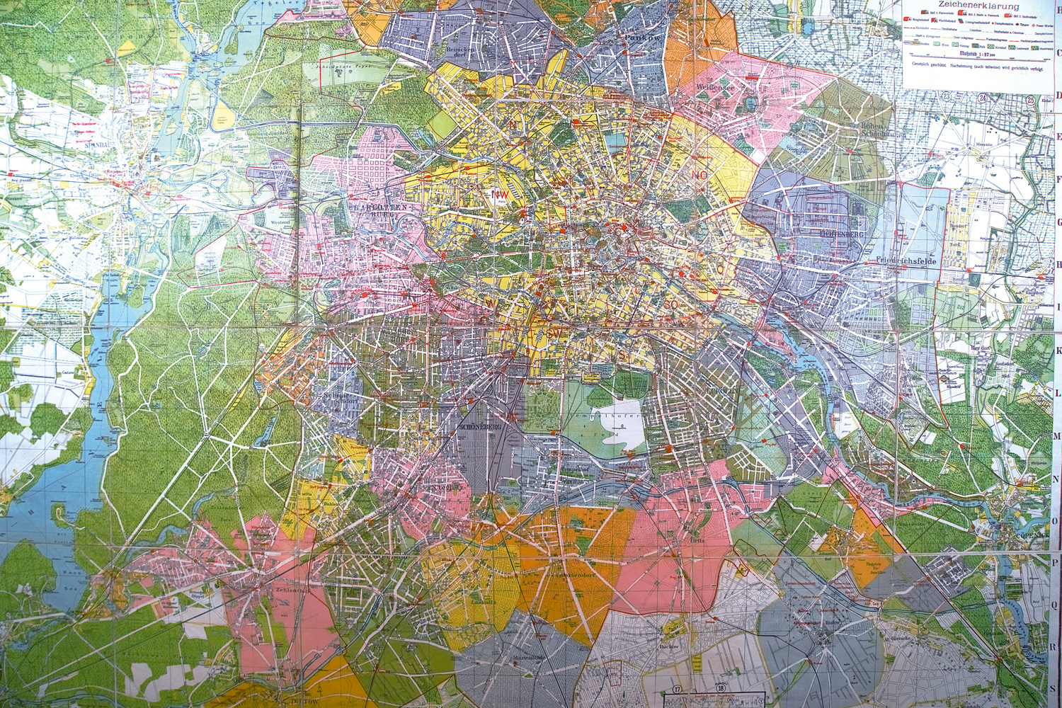 Vorhanden sind: I. G. C. Richter. Grundriss von Berlin und seinen naechsten Umgebungen. Plan de Berlin et de ses plus proches environs. Grenz- und flächenkolorierte Kupferstichkarte in 12 Segmenten auf Leinen aufgezogen. Simon Schropp & Com. 1809. - II. S. Sachs. Grundriss von Berlin. Teils flächenkolorierte Kupferstichkarte. Carl Gall 1812. - III. W. v. Möllendorf. Grundriss von Berlin. Lithographische Karte. A. Bolzani 1826. - IV. Neuester Fremdenführer durch Berlin. Grenz- und Flächenkolorierte Holzschnitt-Karte auf Leinen aufgezogen. Reuter & Stargardt 1848. - V. I. C. Richter. Topographische Karte der Gegend um Berlin. Lithographische Karte. Simon Schropp & Com. 1856. - VI. Louis Gerschel. Plan Berlin. Neue revidierte Ausgabe. Lithographische Karte. L. Gerschel 1859. - VII. Grundriss von Berlin. Ueberdruck des mittleren Theils aus Sineck's SItuaations-Plan von Berlin mit dem Weichbilde und Charlottenburg in vier Blättern. Dietrich Reimer 1871. - VIII. Neuester Grundriss von Berlin. Zweite vollständig berichtigte Auflage. Dietrich Reimer 1871. - IX. Gustav Müller. Karte zur Berechnung des Grund- und Bodenwerkes in Berlin, Charlottenburg und Westend ... Vierzehnter Jahrgang. Chromolithographische Karte. Deutscher Verlag 1914-1915. - X. Gustav Müller. Kiessling's neuer grosser Plan von Berlin und den nächstgelegenen Ortschaften. Chromolithographie. Alexius Kiessling 1930. - XI. Pharus-Reitkarte des Westens Berlins und des Grunewalds. Chromolithographische Karte. Pharus-Verlag 1930. - Und weitere. – Teils mit kleineren bis größeren Gebrauchsspuren, insgesamt wohlerhalten.