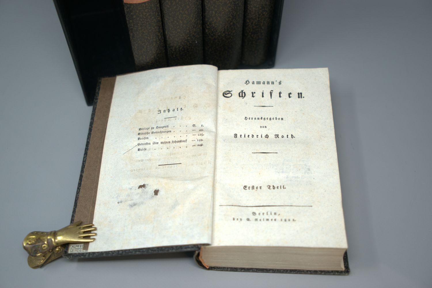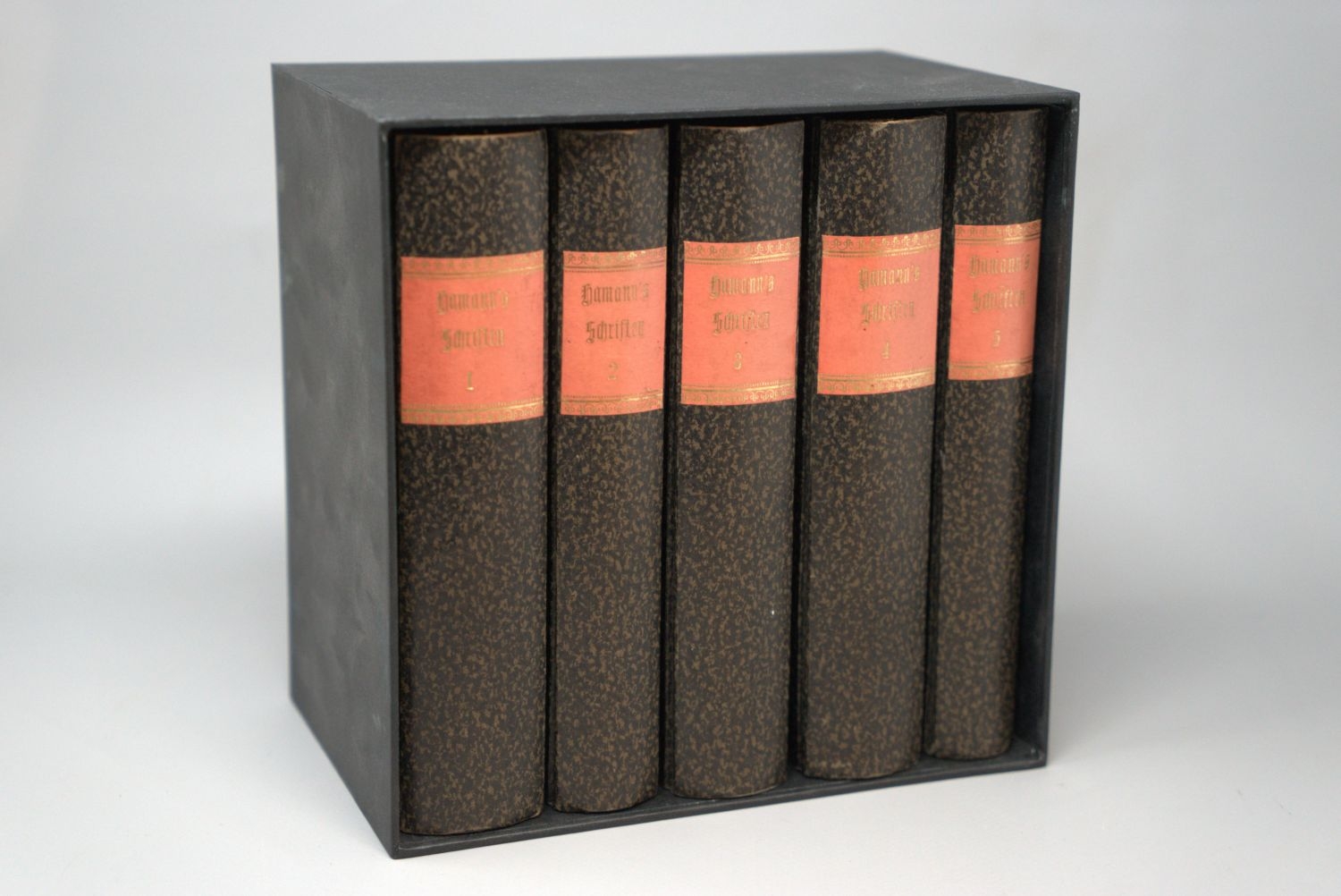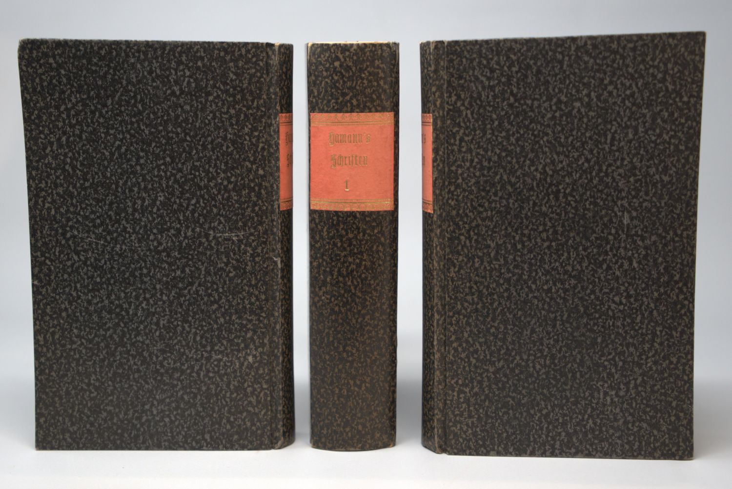 Hamann, Johann Georg. Schriften. Herausgegeben von Fr. Roth und (Band VIII:) G. A. Wiener. 8 Teile in 9 Bänden. Mit gestochenem Portrait. 17 x 10,5 cm. Pappbände des frühen 20. Jahrhunderts mit goldgeprägtem RSchild in zwei neueren Pappschubern. Berlin, Georg Reimer, 1821-1843.