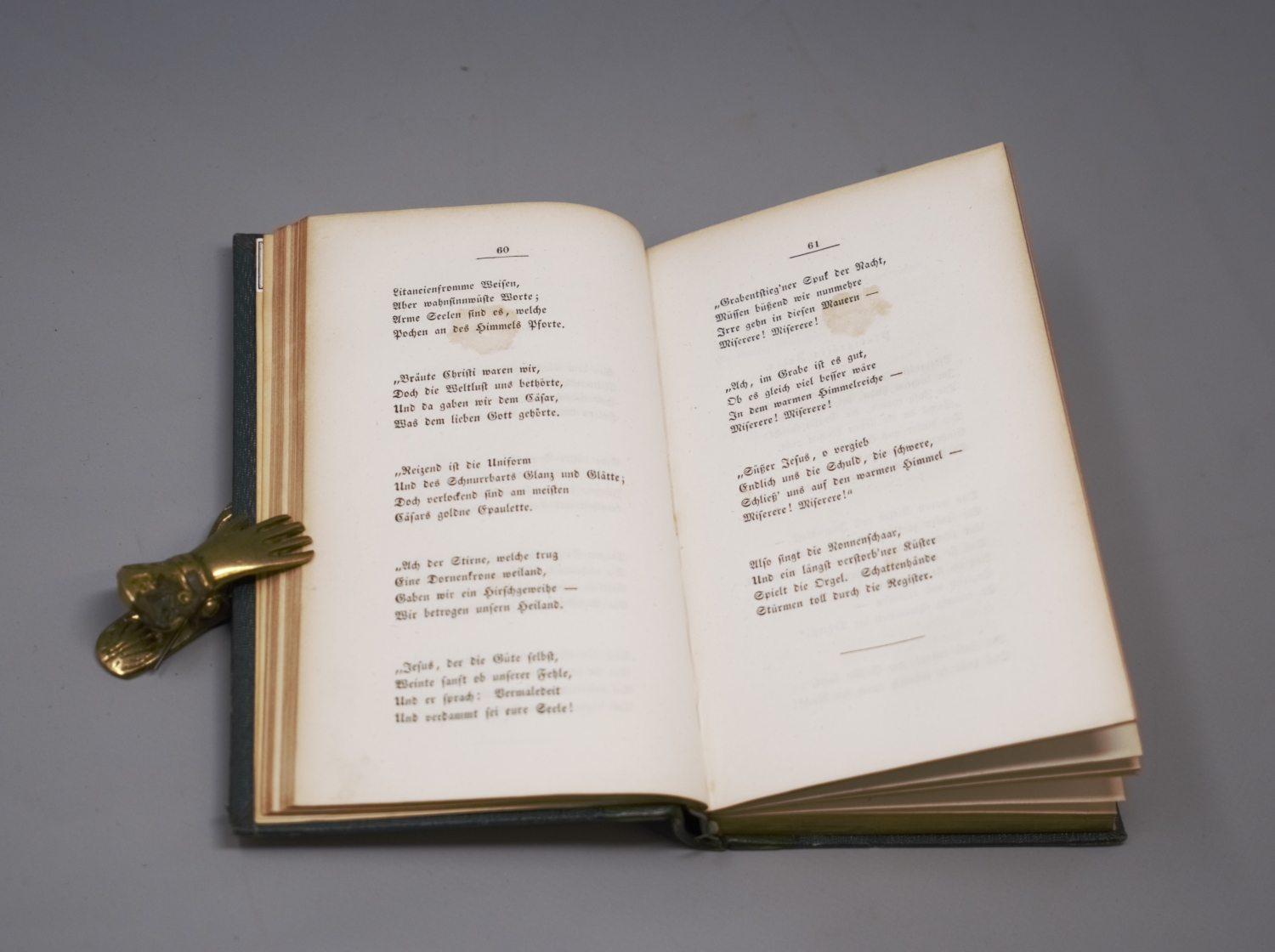 Heine, Heinrich. Romanzero. VI, 313 S. 17,5 x 10,5 cm. Halbleder d. Z. (schwach berieben) mit reicher RVergoldung, goldgeprägtem RTitel sowie Goldschnitt. Hamburg, Hoffmann und Campe, 1851.