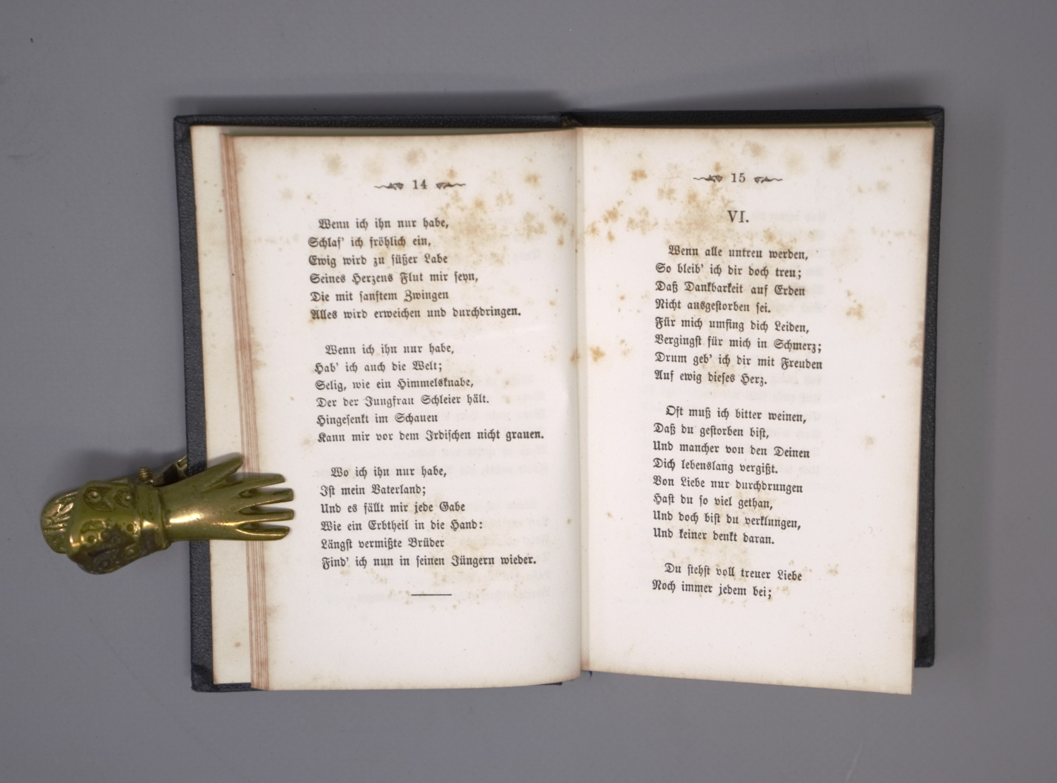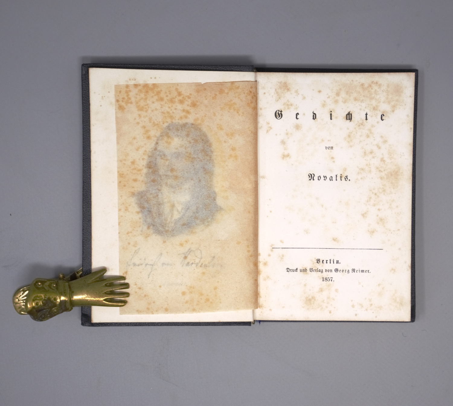 Novalis (d. i. Friedrich von Hardenberg). Gedichte. 2 Bl., 138 S., 1 Bl. Mit gestochenem Portrait. 13 x 8,5 cm. Dunkelgrüner blindgeprägter OLeinenband mit goldgeprägtem Rücken- und Deckeltitel sowie Goldschnitt. Berlin, Georg Reimer, 1857.