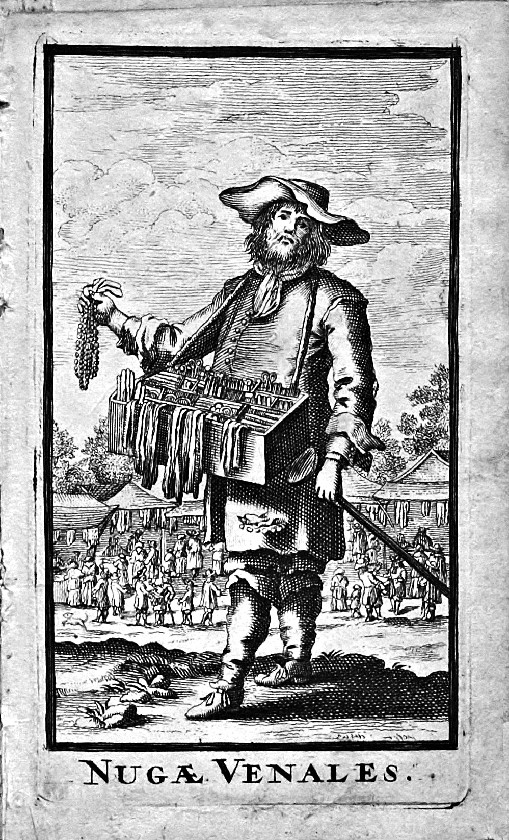 Nugae venales, sive Thesaurus ridendi & jocandi. Ad gravißimos severißimosque viros, patres melancholicorum conscriptos. Editio ultima auctior & correctior. 2 Bl., 323 S. Mit Kupfertafel. 13 x 7,5 cm. Pergament d. Z. (Gelenke angeplatzt) mit hs. RTitel. O. O. u. Dr. 1689.