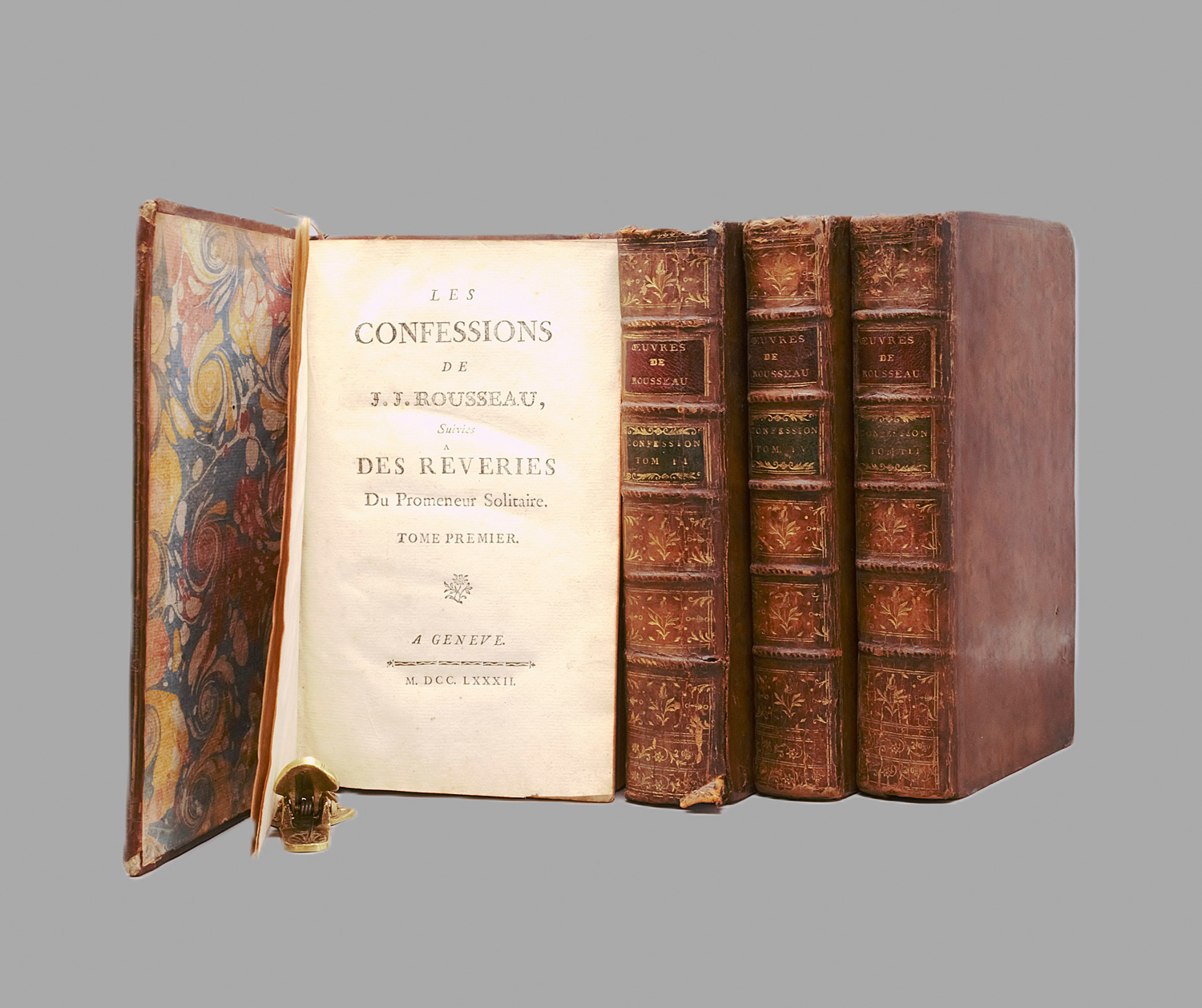 Rousseau, Jean-Jacques. Les confessions, suivies des rêveries du promeneur solitaire. 4 Bände. Leder d. Z. (leicht berieben, Rücken lädiert, Band II stärker, dieser teils hinterlegt) mit RVergoldung und goldgeprägten RSchildern. Genf, o. Dr., 1782-1789.