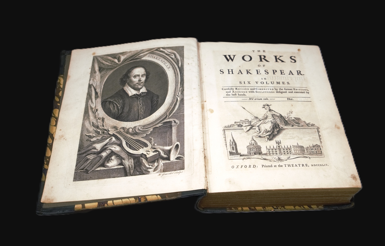 Shakespeare, William. The works in six volumes. Carefully revised and corrected by the former editions, and adorned with sculptures designed and executed by the best hands. 6 Bände. Mit gestochenem Portrait, gestochener TVignette, 25 gestochenen Schlussvigetten und 38 Kupfertafeln. 28,5 x 21,5 cm. Halbleder des 19. Jahrhunderts (etwas beschabt und bestoßen, Kapitale teils mit kleinen Fehlstellen und Einrissen) mit goldgeprägtem RSchild. Oxford 1744.