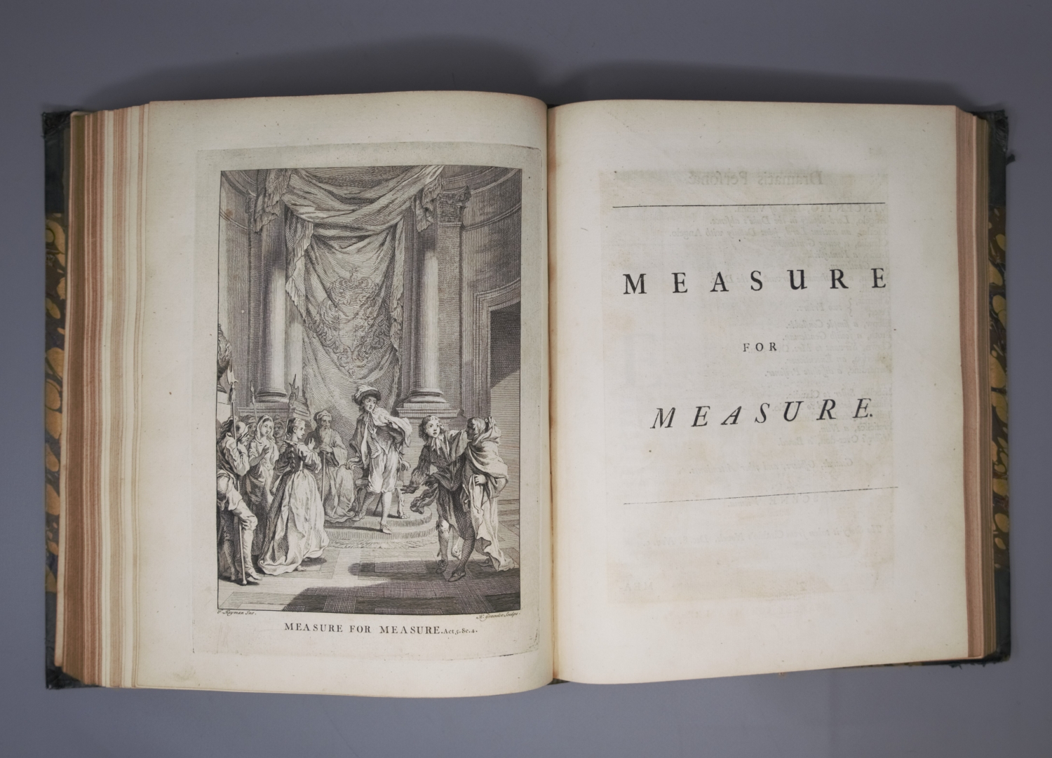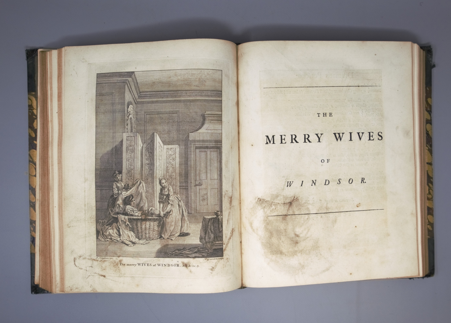 Thimm 17. – Mit einem Vorwort von Alexander Pope (1688-1744) und der berühmten Würdigung von Shakespeares Leben durch Nicolas Rowe (1674-1718). – Innengelenk von Band I angeplatzt, Titel und erste Blatt von Band II mit Wurmgängen. Insgesamt etwas finger-, braun- und stockfleckig.