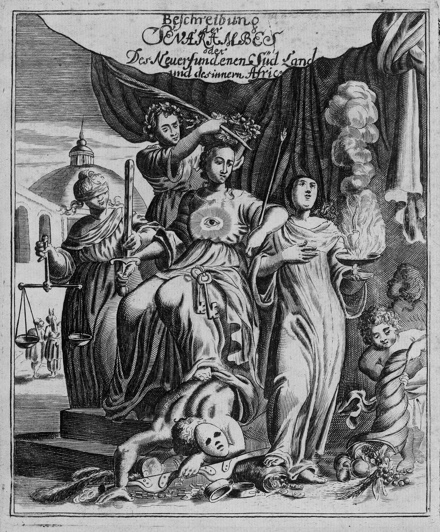 Winter, Compendium Utopiarum I, 105. Paulitschke 679 (nur Anhang). Vgl. Cox II, 473 (englische Ausgabe 1679) und Cox I, 362 (englische Ausgabe des Anhangs 1670). Faber du Faur 1229. Jantz 2565 (beide deutsche Ausgabe 1689). – Titelauflage der dritten deutschen Ausgabe. Die erste und wichtigste Schrift des französischen Utopismus und einer der bedeutendsten und unterhaltsamsten, wenngleich wenig bekannten utopischen Staatsromane des 17. Jahrhunderts. Das auch für die Entwicklung der Gattung Roman bedeutende Werk wurde noch 1783, über hundert Jahre nach seinem Erscheinen, erneut ins Deutsche übersetzt. Es inspirierte Swift zu "Gulliver's Travels" und Defoe zu seinem "Robinson Crusoe". Nach Erscheinen des ersten Teils in London (1675), wohl von Vairasse in englischer Sprache verfasst, folgte die erste französische Gesamtausgabe in Paris (1677-79). Im Anhang berichtet A. Roberts, Übersetzer und Bearbeiter, das Algerienabenteuer eines "T. Smith". Dieser Text erschien zuerst 1670 in London (Cox I, 362). Das "T. S." auf dem Titel verweist auf Smith. Dagegen ist der im Roman enthaltene "Brief" eines "Thomas Skinner" nur Stilmittel im Dienst der Glaubwürdigkeit der Utopie. Dieses Bemühen um Plausibilität ist entscheidend. Der utopische Staat ruht auf denselben Fundamenten wie der wirkliche. Nicht das Phantastische, sondern das Wahrscheinliche interessiert. Das utopische Experiment zielt auf eine Chance zu größerer Gerechtigkeit. Vairasse wird zum Vorläufer des modernen Sozialismus. Erst unter Führung des Staatsgründers Sevarias (Anagramm: Vairasse) entwickeln sich die Severambier im fiktiven Australien - das reale ist nur bruchstückhaft bekannt - zur Vollkommenheit. Vairasse vergleicht die zu gründenden Institutionen mit tatsächlichen in Europa und bildet die Herrschaftselemente präkolumbischen und orientalischen Staaten nach. Damit kommt seine Utopie der Forderung zeitgenössischer Poetiken nach Abbildung des Tatsächlichen oder Wahrscheinlichen näher als die der Vorläufer Morus, Campanella oder Foigny. Das Frontispiz zeigt die von den Figuren der Gerechtigkeit und des Glaubens umringte, mit dem Lorbeer bekränzte Allegorie der Vernunft als Herrscherin über Lüge und Tyrannei. – Gering gebräunt und vereinzelt leicht stockfleckig, Titel mit hinterlegter Dünnstelle durch Rasur, ohne fl. Vorsätze.