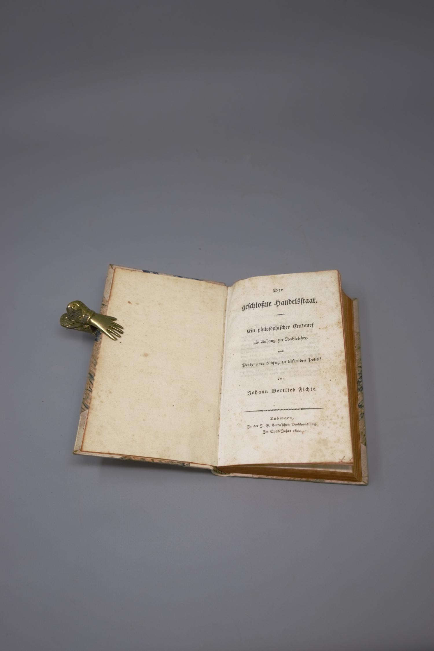 Ziegenfuss I, 341. Baumgartner-Jacobs 51. – Seltene erste Ausgabe der bedeutendsten philosophisch-staatswissenschaftlichen Abhandlung Fichtes, die der Autor selbst "als sein bestes und durchdachtestes Werk" bezeichnete. Lange vor Marx und Engels entwirft Fichte ein in seinen Grundzügen sozialistisches Gemeinwesen, das mehr aus der Rechtslehre deduziert als von historischer Forschung abgeleitet wurde. Die Aufgabe des Staates sieht Fichte nicht so sehr in der Besitzsicherung für den Einzelnen als vielmehr in der gerechten Verteilung der Güter, die übermäßigen Reichtum und damit auch Armut verhindern sollen. Fichte empfiehlt ein autarkes Wirtschaftssystem, das Krisen und Kriege zu verhindern vermag. – Etwas braunfleckig..