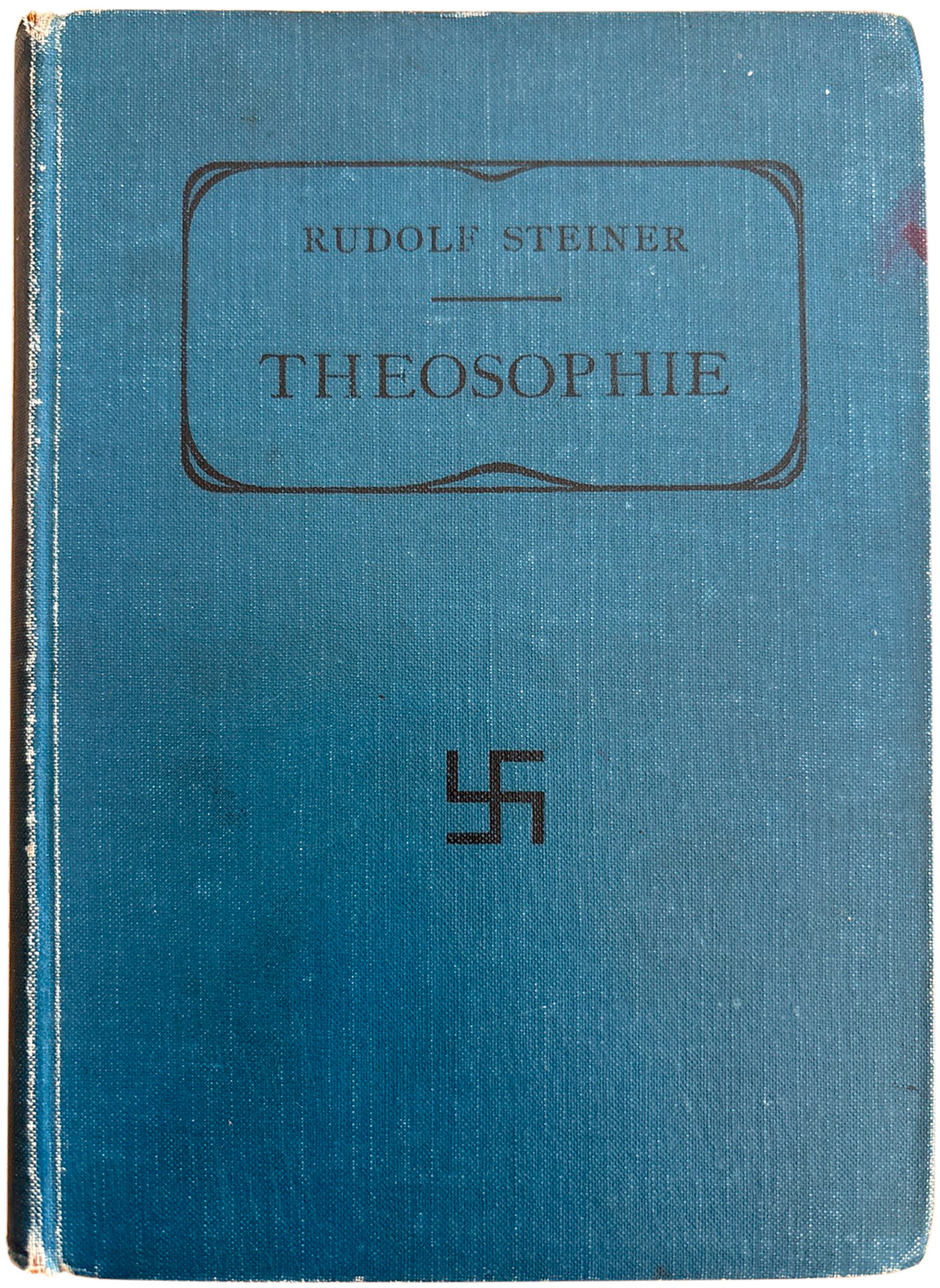 Steiner, Rudolf. Theosophie. Einführung in übersinnliche Welterkenntnis und Menschheitsbestimmung. VII, 167 S. 18,5 x 12,5 cm. Blauer OLeinenband (etwas fleckig, berieben und bestoßen, hinteres Gelenk geplatzt) mit schwarzgeprägtem Rücken- und Deckeltitel sowie geprägter Swastika. Leipzig, M. Altmann, (1904).