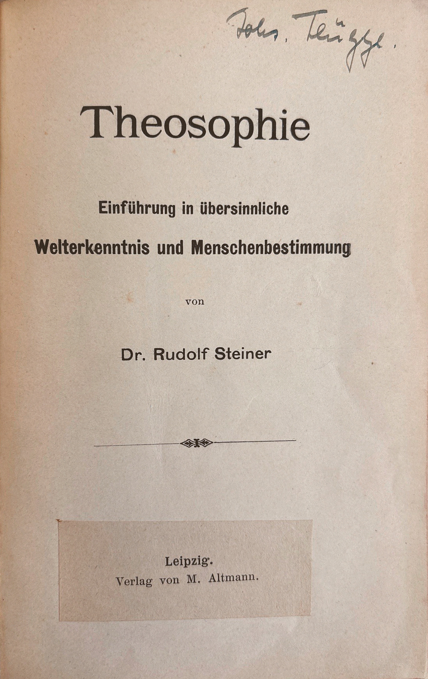 Ziegenfuß II, 632. – Erste Ausgabe von Steiners Hauptwerk, in dem er die von ihm vertretene Lehre erstmals ausführlich darlegt. Exemplar der Restauflage, die von Altmann in Leipzig vom Berliner Verleger Schwetschke übernommen wurde, mit entsprechend überklebtem Impressum. Eine kollationsgleiche zweite Auflage erschien ebenda 1908. – Titel im Bug mit Vorsatz verklebt und oben mit kleinem Einriss, Schlussblatt lose und mit Papierläsur im Seitenrand, Block etwas verschoben. Titel mit hs. Besitzeintrag des Pädagogen Johannes Flügge (1905-1995).