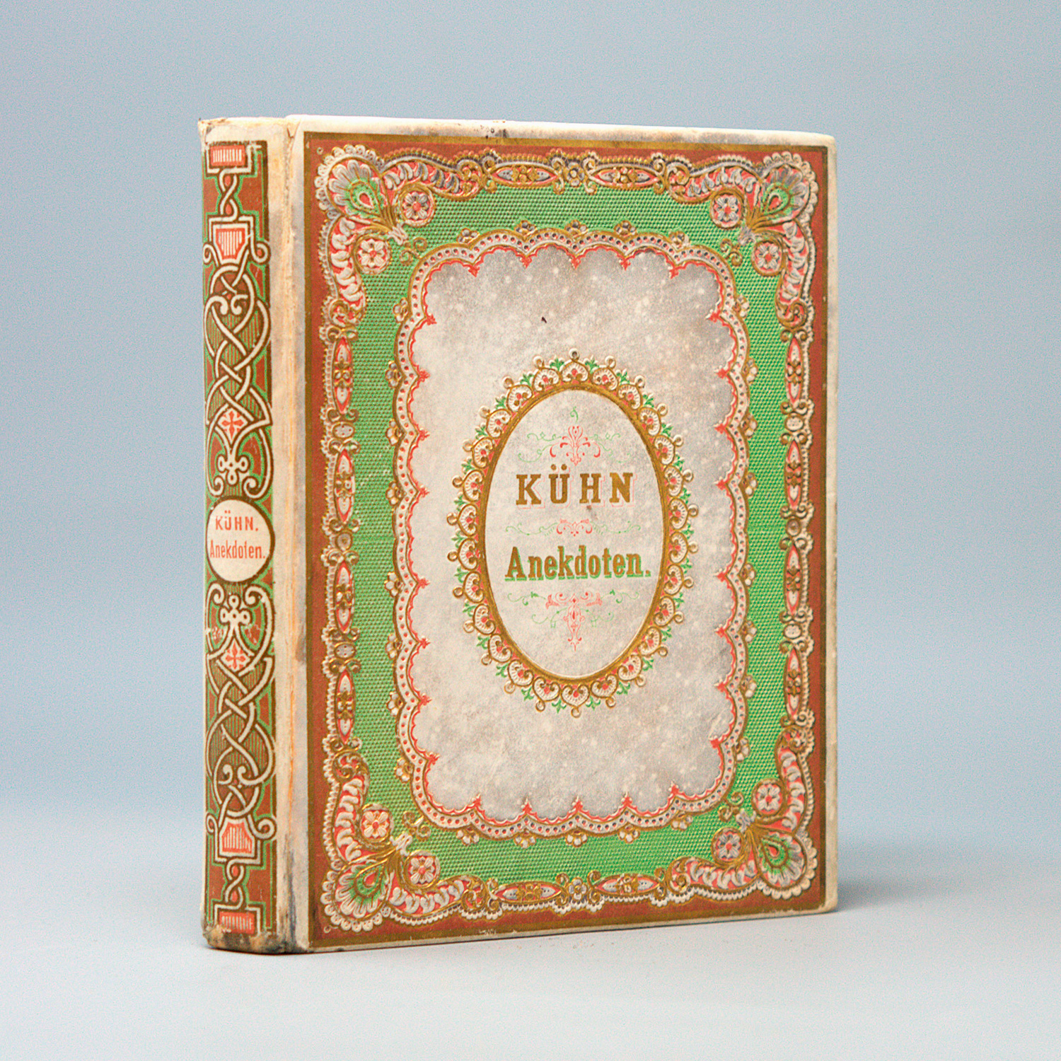 Kühn, Franz. Anekdoten und Erzählungen meist historischen Inhalts. Für Kinder von 7 bis 10 Jahren. Zweite Auflage. 212 S. Mit 7 (statt 8) kolorierten lithographischen Tafeln. 14,5 x 11 cm. OPappband (berieben, hinteres Gelenk geplatzt, Deckel gelockert). Stuttgart, Rudolph Chelius, 1862.