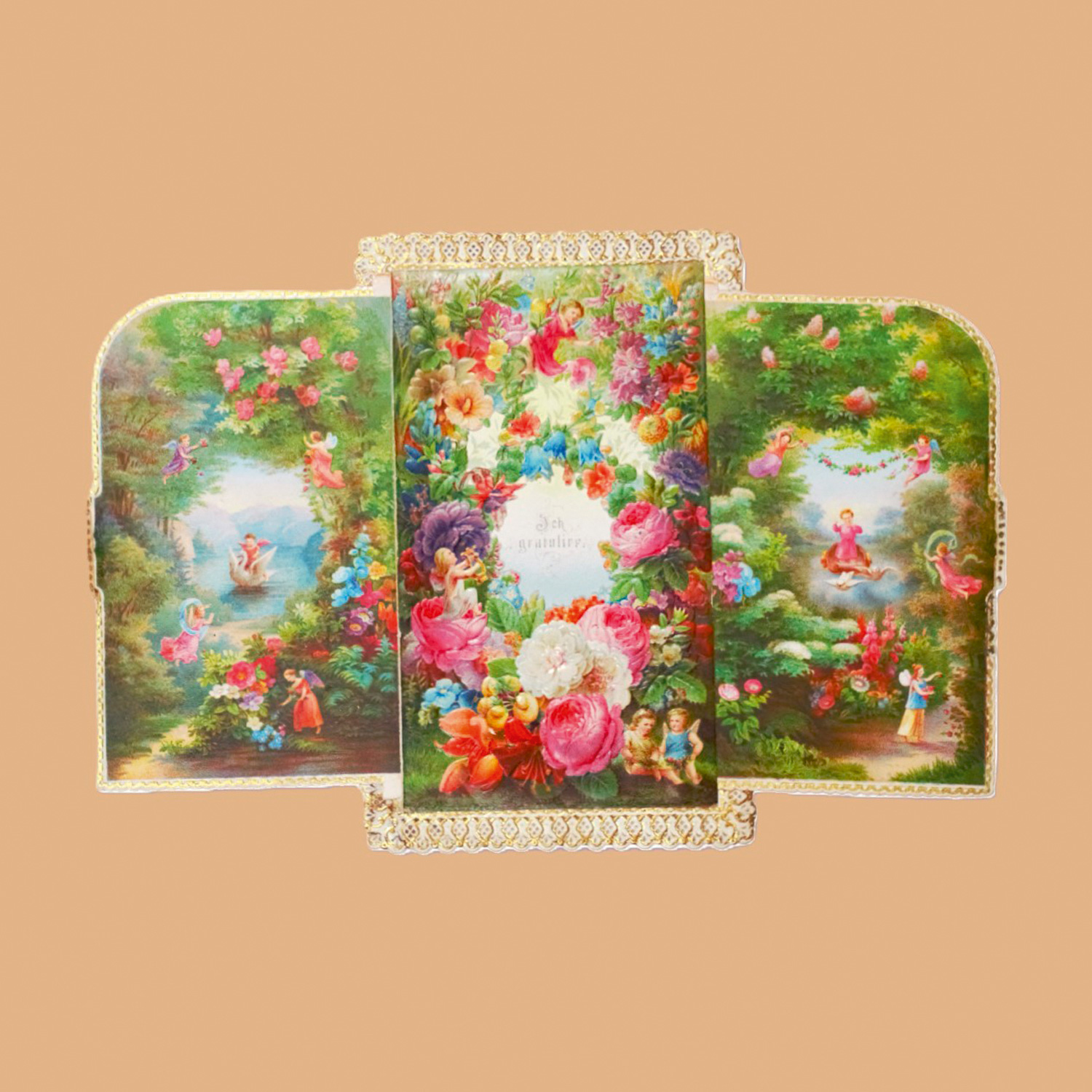 Verso beschriebene, als Triptychon gestaltete Geburtstagskarte von der "liebenden Pensionsschwester Alma" mit zahlreichen dekorierenden Engeln an einer Waldgrenze am See. – Kleine Hinterlegung am Rahmen, sonst sehr gut erhalten.