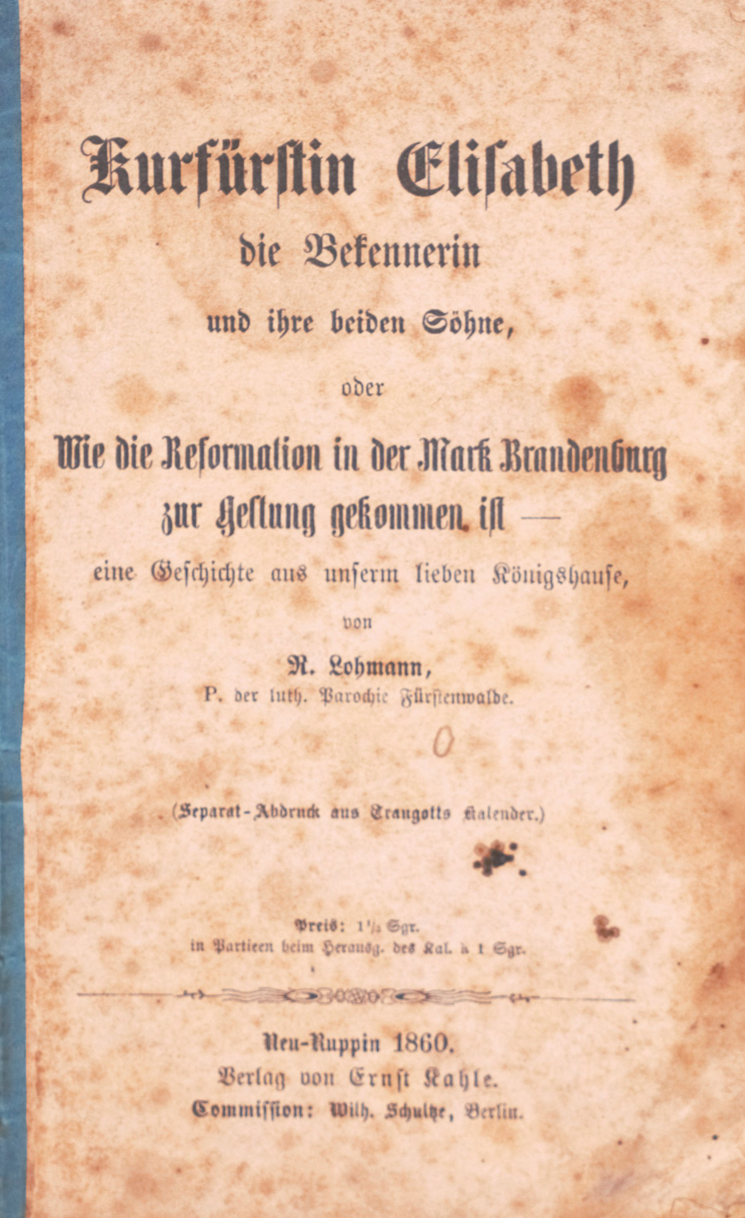 Lohmann, R. Kurfürstin Elisabeth die Bekennerin und ihre beiden Söhne, oder Wie die Reformation in der Mark Brandenburg zur Geltung gekommen ist - eine Geschichte aus unserm lieben Königshause (Separat-Abdruck aus Traugotts Kalender). 27 S. 17 x 10,5 cm. Heftstreifen (ohne Einband). Neuruppin, C. Buchbinder für Ernst Kahle, 1860.
