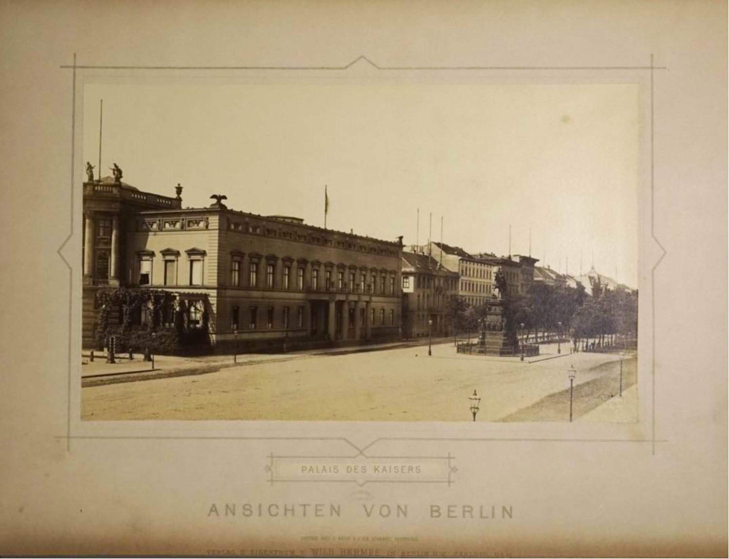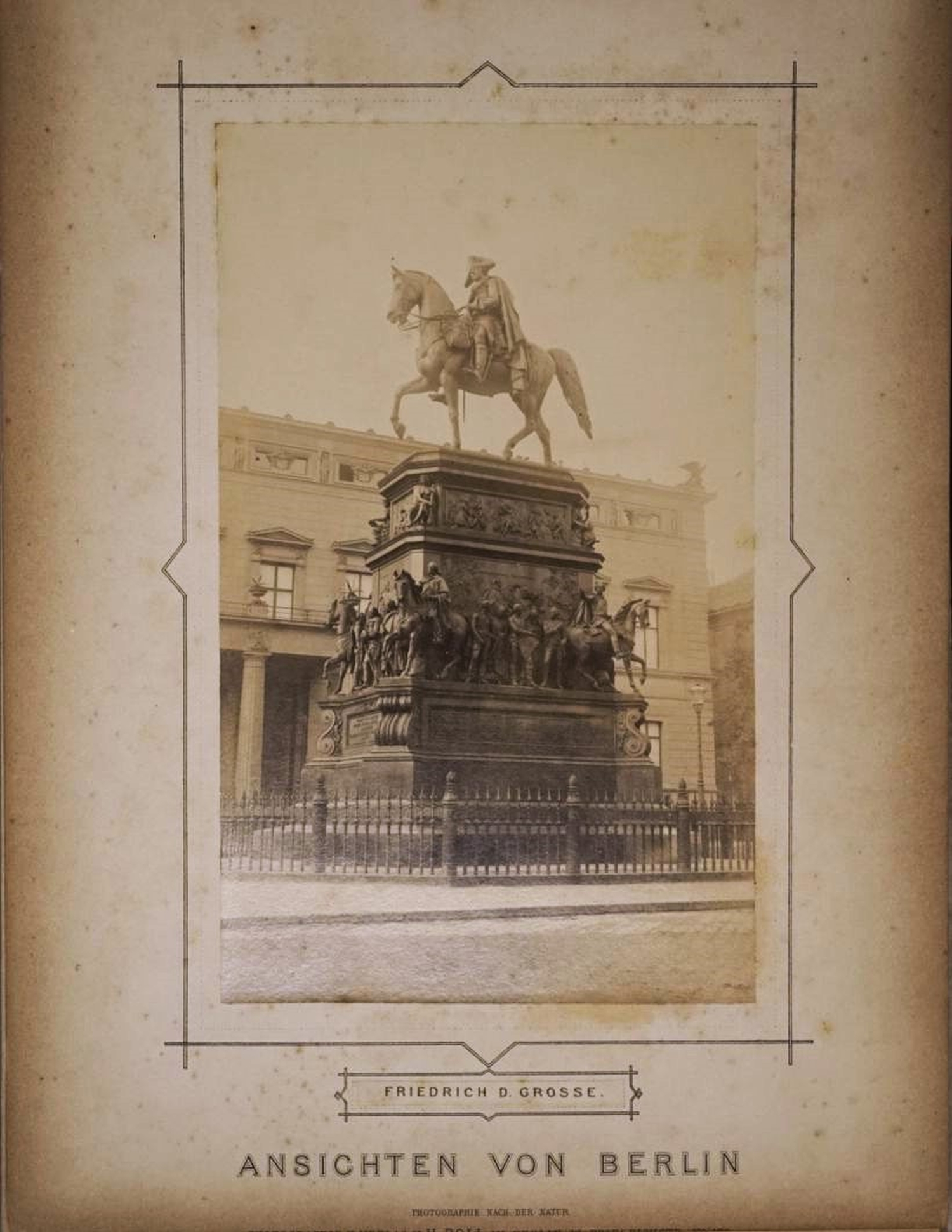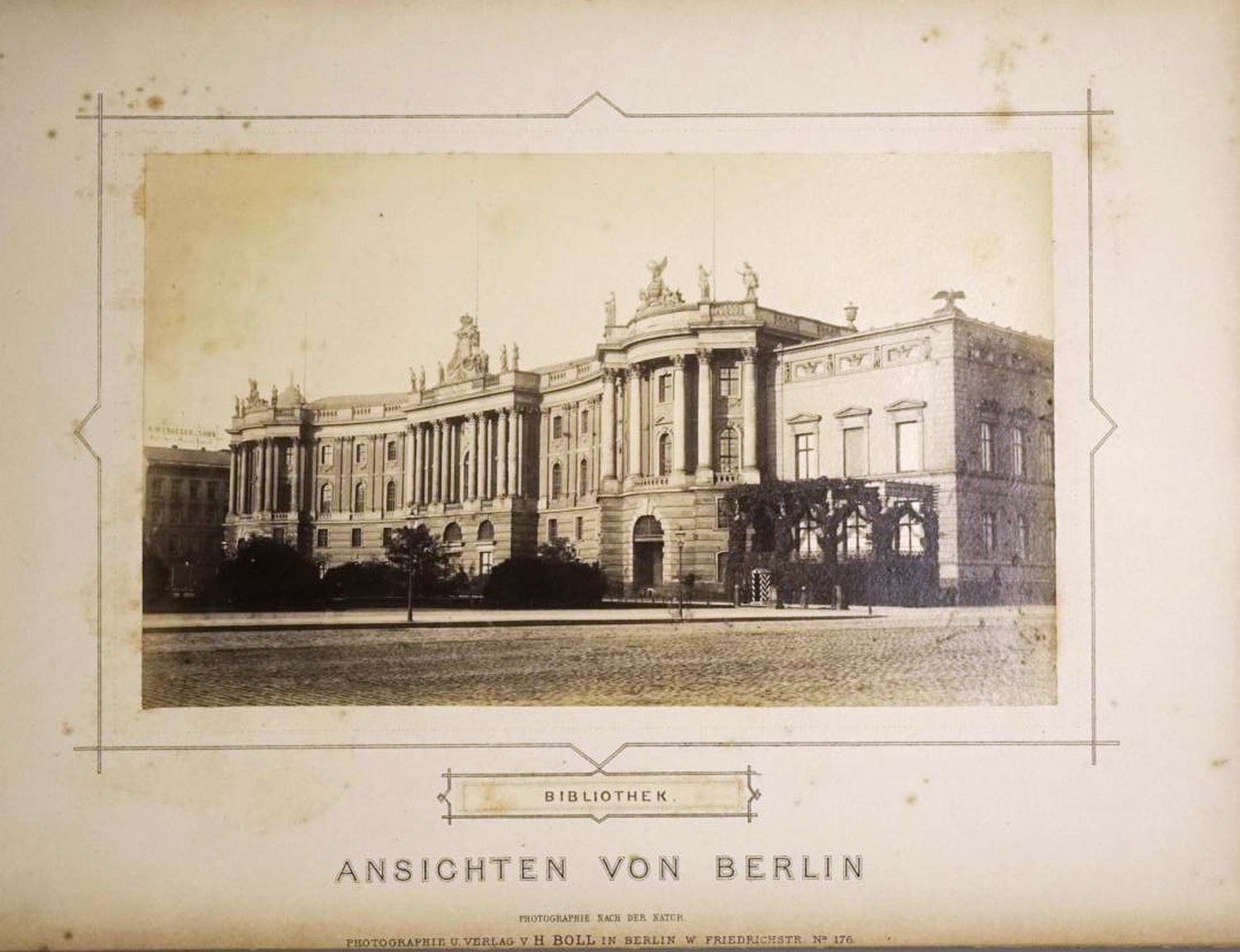Das Album umfasst zahlreiche Sehenswürdigkeiten der Stadt Berlin. Dargestellt sind zum Beispiel "Friedrich der Grosse", "Denkmal Friedr. Wilh. III", "Palais des Kaisers", "Bibliothek", "Palais des Kronprinzen", "Königl. Schloss/Kurfürstendenkm.", "Rathhaus", "Linden/Brandenburger Tor", "Königsplatz v. Kroll gesehen", "Universität", "Ruhmeshalle / Schlossbrücke", "Nationalgalerie", "Museum", "Opernhaus/Hedwigs Kirche", "Gendarmenmarkt", "Domkirche vom Museum", "Belle Alliance Platz", etc. – Teils knapp beschnitten. Papierbedingt gebräunt und etwas stockfleckig.