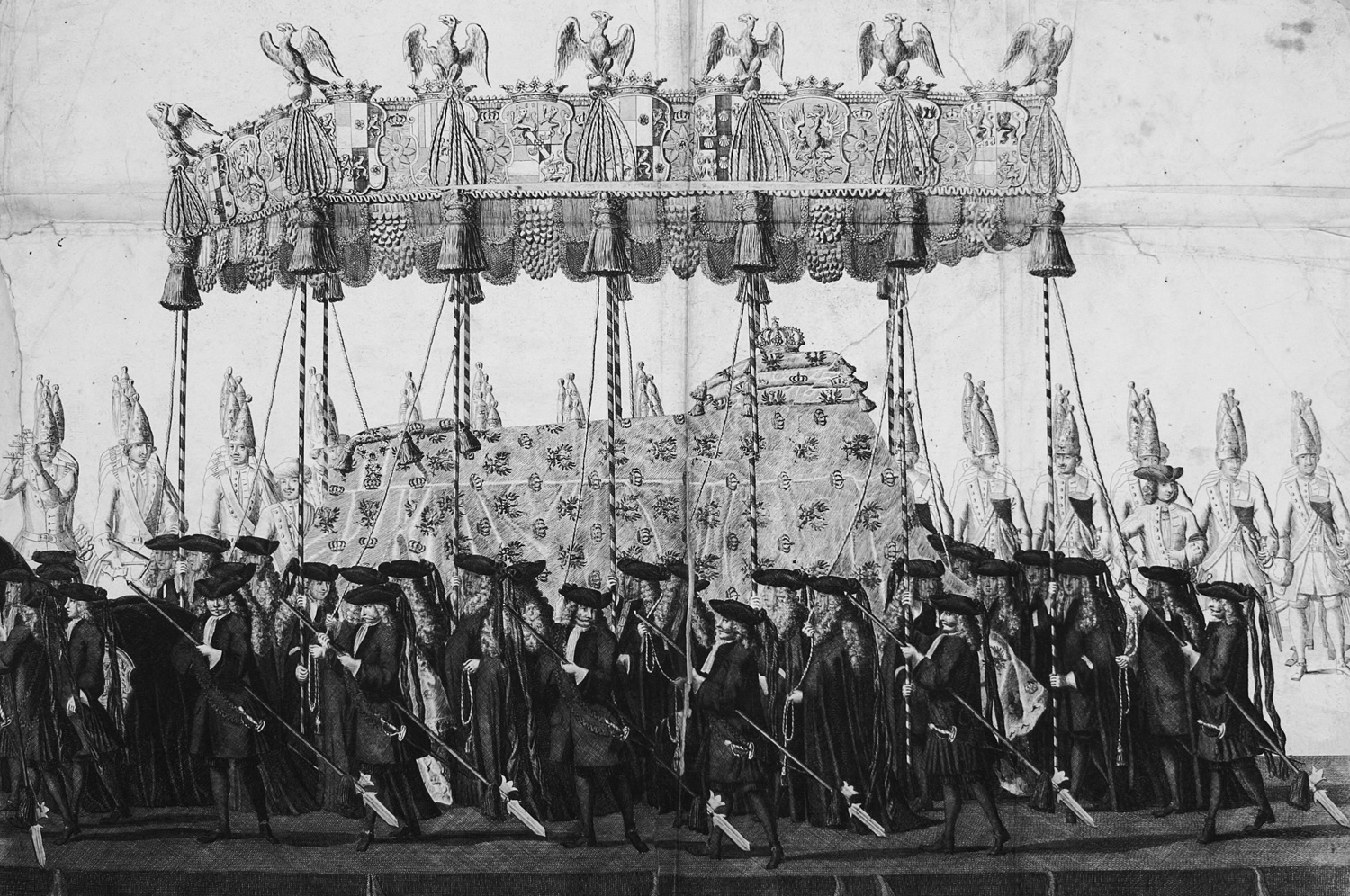 Sein erster Auftrag als Hofkupferstecher war die Anfertigung der Stiche anlässlich der Krönung des ersten preußischen Königs, Friedrichs I. (1657-1713). Da aber das Jahr darauf dessen Frau, Sophie Charlotte (1668-1705), starb und Wolfgang auch dafür Kupferstiche anfertigen sollte, konnten die Stiche nicht rechtzeitig für das Krönungswerk fertiggestellt werden und wurden erst mit einer 2. Auflage des Textteils 1712 veröffentlicht. Als Friedrich I. 1713 wurde Wolfgang beauftragt den Leichenzug und den Sarg begleitend zu einem Textband darzustellen. – Ohne den Textband. Es fehlen die Kupfertafeln 7, 13, 29, 55 und 118-120. Bei der doppelblattgroßen Tafel 2 fehlt die linke Hälfte. Die mehrfach gefaltete Tafel (99) hinterlegt. Durchlaufender Wasserfleck, die Tafeln mit größeren Einrissen (auch in die Darstellung), fleckig und eselsohrig.