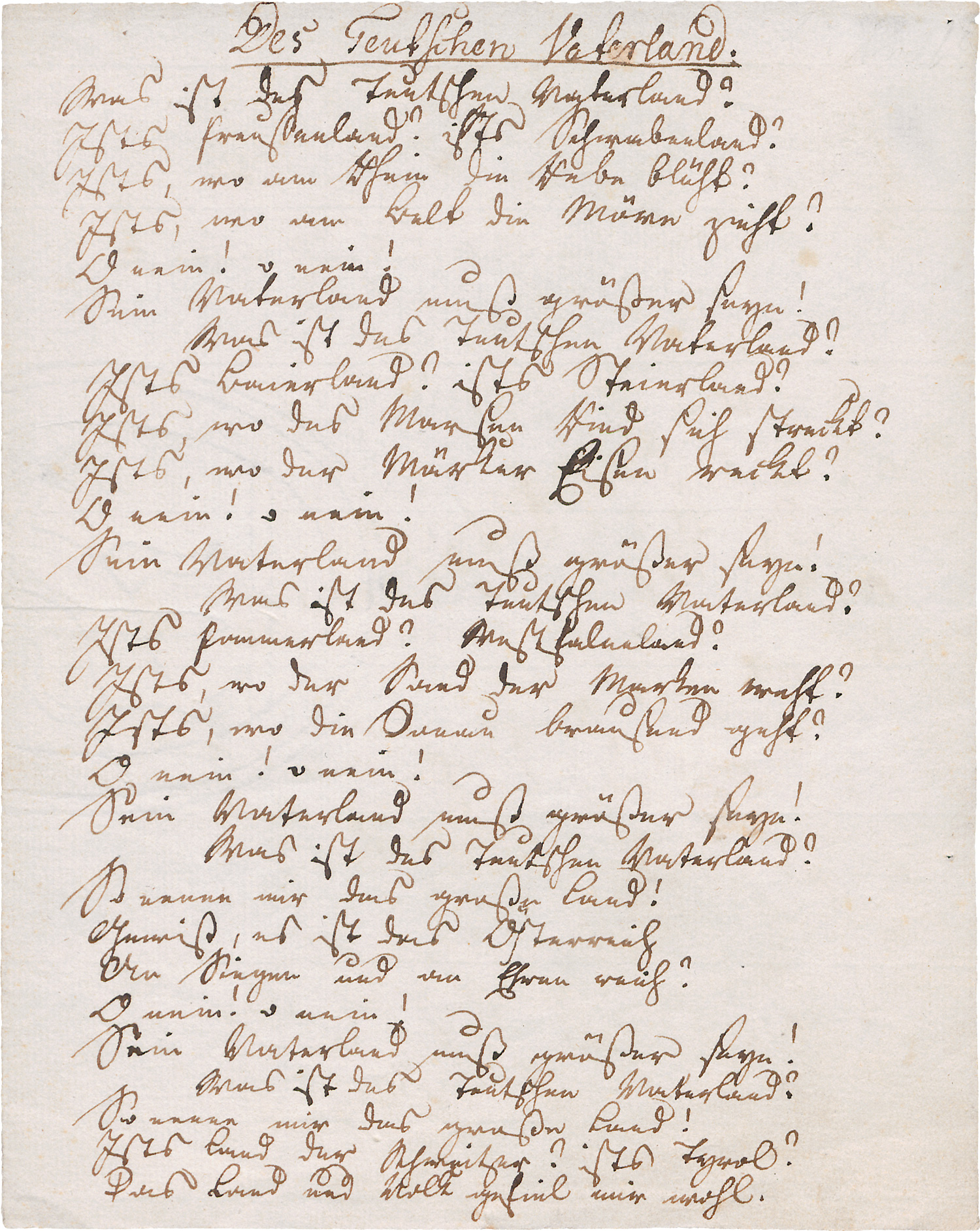 "Des Teutschen Vaterland". 10 Strophen zu je 4 Zeilen. Eigenhändige vollständige Niederschrift einer frühen Fassung von Arndts wohl berühmtestem Gedicht; vielleicht für den Abdruck in einem Buch oder einer Zeitschrift bestimmt. Die erste und die letzte Strophe lauten: "Was ist des Teutschen Vaterland? / Ists Preußenland? ists Schwabenland? / Ists, wo am Rhein die Rebe blüht? / Ists wo am Belt die Möve zieht? / O nein, o nein! / Sein Vaterland muß größer seyn! ... Das ganze Teutschland soll es seyn! / O Gott vom Himmel sieh darein! / Und gieb uns rechten teutschen Muth, / Daß wir es lieben treu und gut. / Das soll es seyn! / Das ganze Teutschland soll es seyn!" - Mit vielen Abweichungen vom späteren Druck. - Das 1813 noch vor der Leipziger Völkerschlacht entstandene Lied fand erst in der zweiten Vertonung die große Verbreitung, die es dann im Verlauf des 19. Jahrhunderts erlebte. Die heute pathetisch anmutende Sprache greift treffend die Stimmung der großen Befreiungsbewegung auf, mit dem erträumten Ziel einer Einigung des zersplitterten deutschen Reiches. - Auf einer 2015 bei uns versteigerten späteren, signierten Version schrieb der Dichter im Anhang: "NB. Dieses Lied hab' ich ausgewält [!], nicht als ob ich es für das beste meiner Reime hielte, sondern weil es am meisten Lauf gewonnen hat." - Kleiner Fleck auf der zweiten Seite.