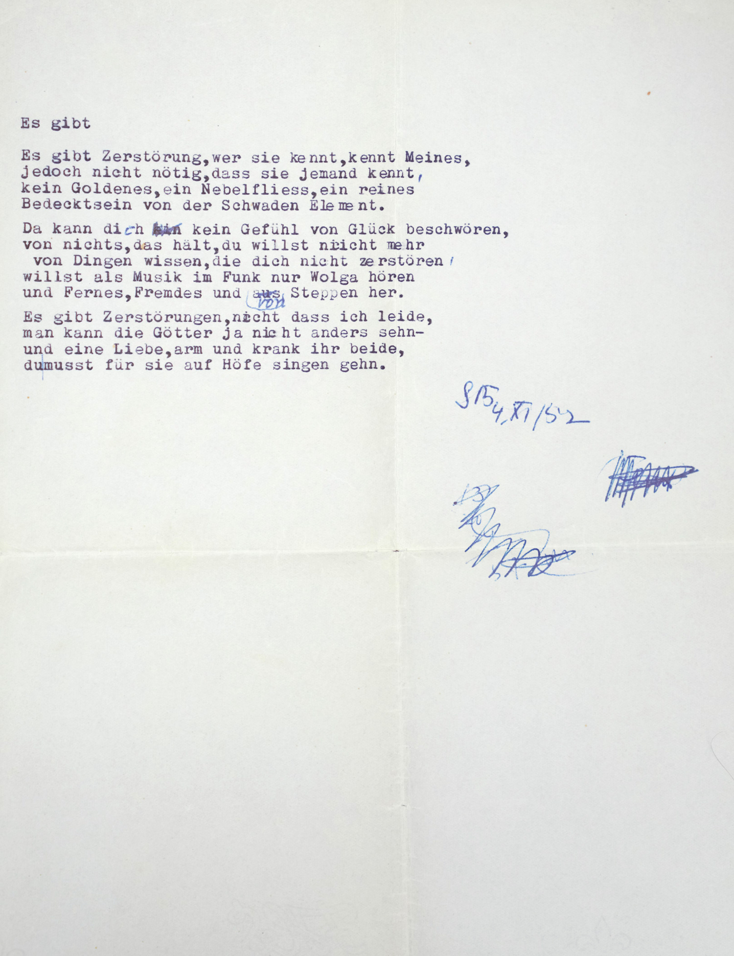 "Es gibt". 13 Zeilen. "Es gibt Zerstörung, wer sie kennt, kennt Meines, / Jedoch nicht nötig, dass sie jemand kennt, / kein Goldenes, ein Nebelfliess, ein reines / Bedecktsein von der Schwaden Element ...". Mit 2 handschriftlichen Korrekturen. - Unter Monogramm und Datum noch 2 durchgestrichene Notizen ("Benn"? und Ziffern). Faltspuren.