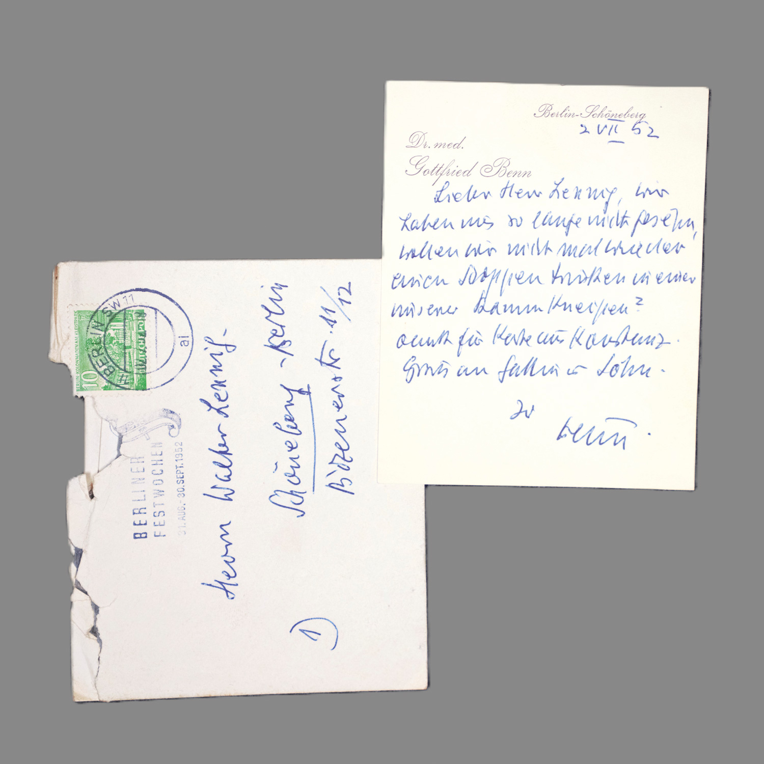 Benn, Gottfried (1886-1956). Eigh. Brief-Karte m. U. "Ihr Benn". Mit gedrucktem Briefkopf "Dr. med. Gottfried Benn". 1 S. 11 x 9 cm. Mit dem eigh. Briefumschlag. Berlin-Schöneberg 2.VII.1952.