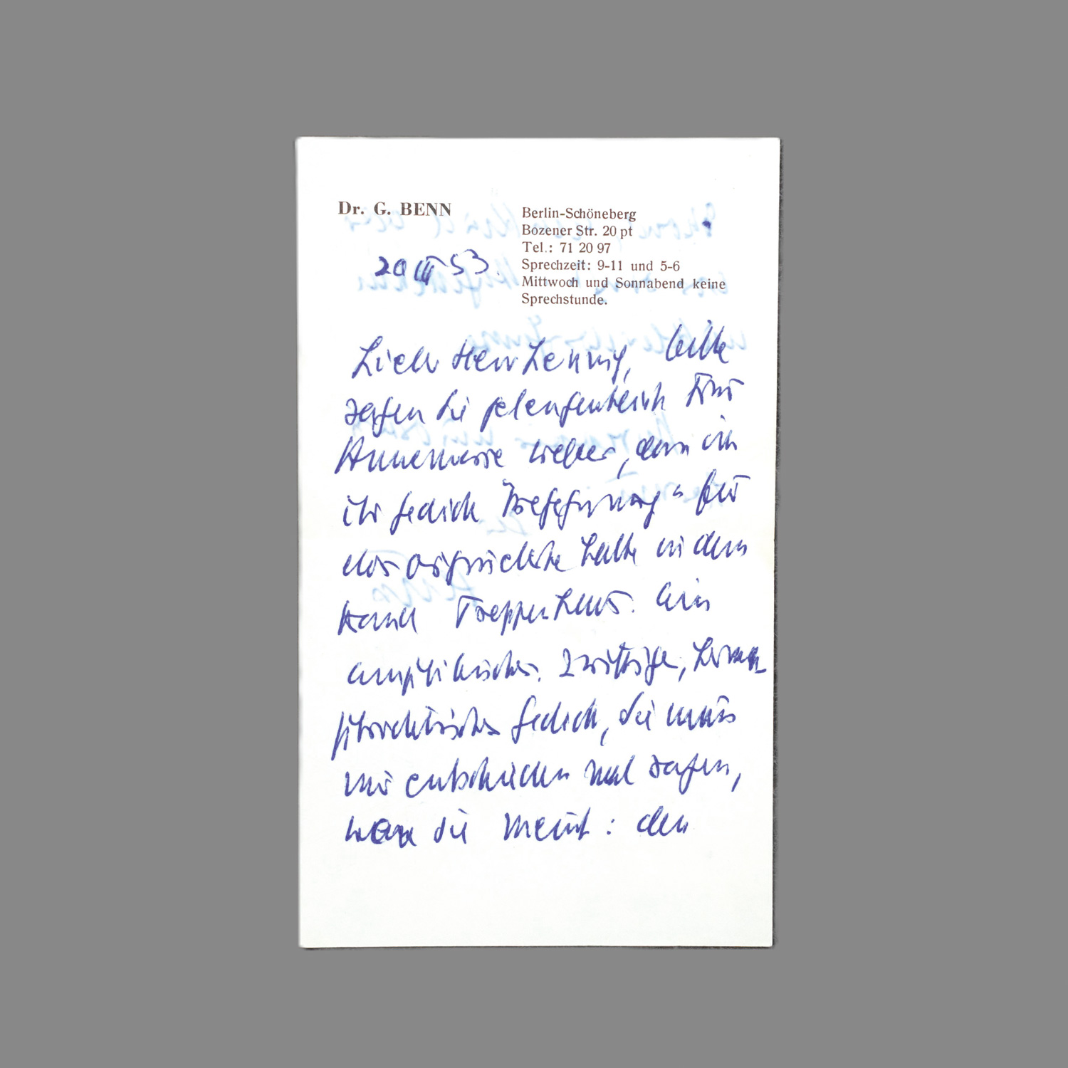 Benn, Gottfried (1886-1956). Eigh. Brief m. U. "Benn". 11/2 S. Mit gedrucktem Briefkopf "Dr. G. Benn". Kl. 8vo. Berlin-Schöneberg 20.III.1953.