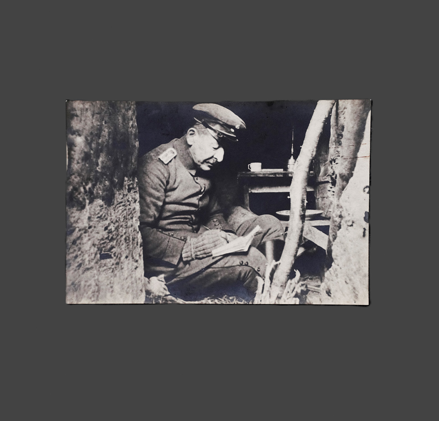An eine Verehrerin in Hamburg. "... Entschuldigen Sie, daß ich Ihnen erst heute den 'Michel' für Ihre Moskauer Freunde schicke; ich hatte kein Exemplar mehr hier, musste mir erst eins schicken lassen. Im Buchhandel erscheint die Dichtung übrigens erst am Tag der Première; ich bitte Sie deshalb, Herrn Kowalsky zu schreiben, er möchte den fraglichen Aufsatz keinesfalls vor dem 12.-15. November deutschen Datums veröffentlichen. Es würde doch einen wenig angemessenen Eindruck machen, wenn gerade dies Buch in einer russischen Zeitschrift früher besprochen würde als in Deutschland. Vielleicht wird es Herrn Kowalsky auch interessieren, daß nächstens eine russische Übersetzung meiner 'Gesammelten Werke' von Lydia Lepaschkin zu erscheinen beginnt ...". - Dehmels Komödie "Michel Michael", die 1911 bei S. Fischer erschien, wurde am 11. Nov. im Hamburger Deutschen Schauspielhaus uraufgeführt. - In der Postkarte teilt Dehmel mit, dass er soeben aus Bingen zurückgekehrt sei, wo er den 70. Geburtstag seines Schwiegervaters gefeiert habe. Die Karte an seine Frau konnte noch nicht beantwortet werden, weil "Frau Iri" gleich nach Schwalbach weitergereist sei. "... nun müssen Sie vorkäufig mit mir Einsiedler vorliebnehmen." [22.V.1906]. - Beiliegend ein eigenhändiger Briefumschlag Dehmels, gerichtet an den Wiener Schriftsteller und Burgtheaterdirektor Anton Wildgans, sowie eine Orig.-Photographie (10,8 x 16 cm), die laut rückseitigem Vermerk Richard Dehmel als Leutnant im Schützengraben bei Autrêches im Januar/Februar 1915 zeigt, wie er Eintragungen in ein Notizbuch schreibt. Zus. 4 Teile.