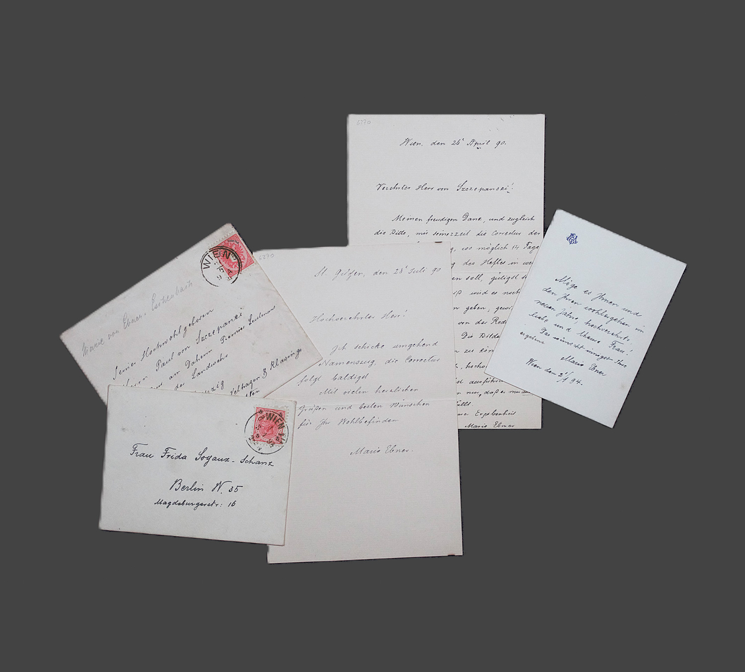 Ebner-Eschenbach, Marie Freifrau von, Schriftstellerin (1830-1916). 3 eigh. Briefe m. U. "Marie Ebner". Zus. 21/2 S. Verschied. Formate. Mit 2 eigh. Umschlägen. Wien und St. Gilgen 1890-1894.
