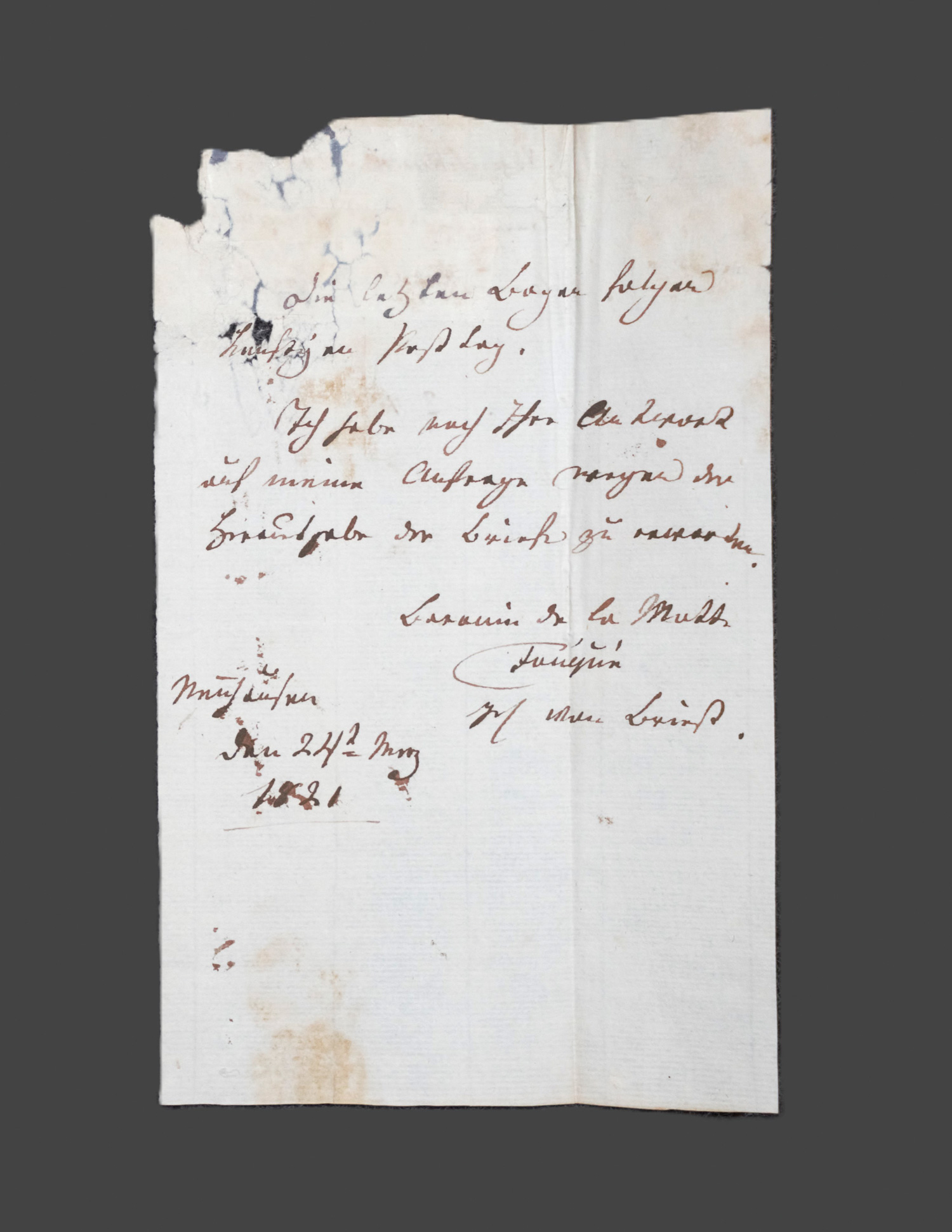An den Berliner Musik- und Belletristik-Verleger Adolph M. Schlesinger. "Euer Wohlgeb. Sagten mir einmal, mit einer Dame allzu genau zu handeln sei nicht Ihre Sache, in dieser Rücksicht komme es Ihnen nicht auf etwas Mehr oder Weniger an. Sie haben mir ... diesmal nur 10 Frdr: abgehandelt. Ich werde mich indeß billiger finden lassen, und bestehe nur auf 24 Frdr: statt 30 Frdr: Hierbei muß es aber bleiben. Sie nun bei Ihrer frühern Äußerung in Betreff der Galanterie nehmend setze ich es voraus, daß Sie [auf] meine Foderung eingehen und verheiße Ihnen dafür 3 Briefe über Berlin, worin alle Feste dieses Jahres beschrieben sind, die Sie in den Freimüthigen einrücken oder vielleicht als eine einzelne kleine Brochure drucken lassen können ...". - Nach Auflistung einiger Rechnungsposten fügt sie an: "... Es erfolgt ein Theil des Manuscriptes der Briefsammlung nebst dem Tittel. Die 3 Briefe über Berlin sind bereits in den Händen der Fr: Grosfürstin und Sie können glauben daß Berlin darauf sehr lüstern ist." - Im zweiten, kurzen Brief, eher einem Billet, heißt es: "Die letzten Bogen folgen künftigen Posttag. Ich habe noch Ihre Antwort auf meine Anfrage wegen der Herausgabe der Briefe zu erwarten" [24.III.1821]. - Carolines "Briefe über Berlin, im Winter 1821" (52 S.) erschienen 1822 bei Schlesinger. - Beide Schreiben mit Papierschäden durch Feuchtigkeit am oberen Rand, mit geringem Buchstabenverlust. - Selten.